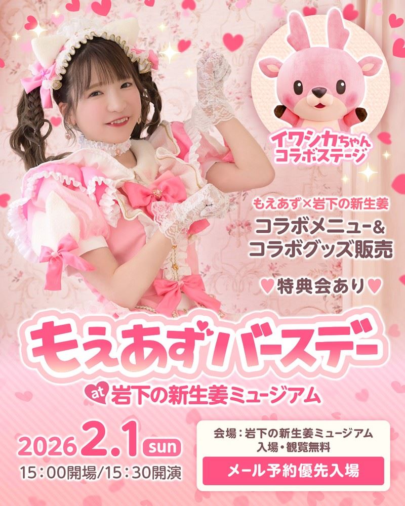 そして、2月1日(日)には、もえあずのバースデーイベント「もえあずバースデーat岩下の新生姜ミュージアム」が開催される。15:00開場、15:30開演で、ステージ終了後には物販・特典会も予定されている。入場・観覧は無料。事前メール予約はすでに終了しているものの、当日立ち見での観覧は可能となっているので、足を運んでみるのもいいかもしれない。
