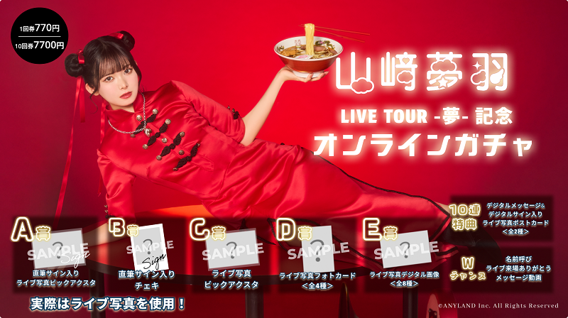 また、本公演を記念し、ANYLANDオンラインガチャによる「山﨑夢羽 LIVE TOUR -夢- 記念オンラインガチャ」を22日より実施。1月17日に行われた公演内のライブ写真を使用した、ここでしか手に入らない豪華グッズを数種類用意したハズレ無しのオンラインガチャとなっている。