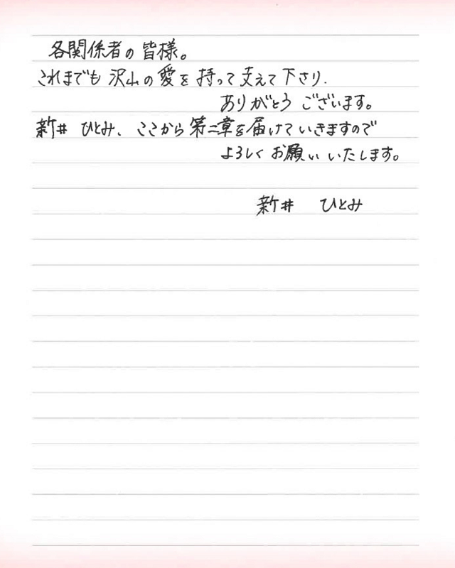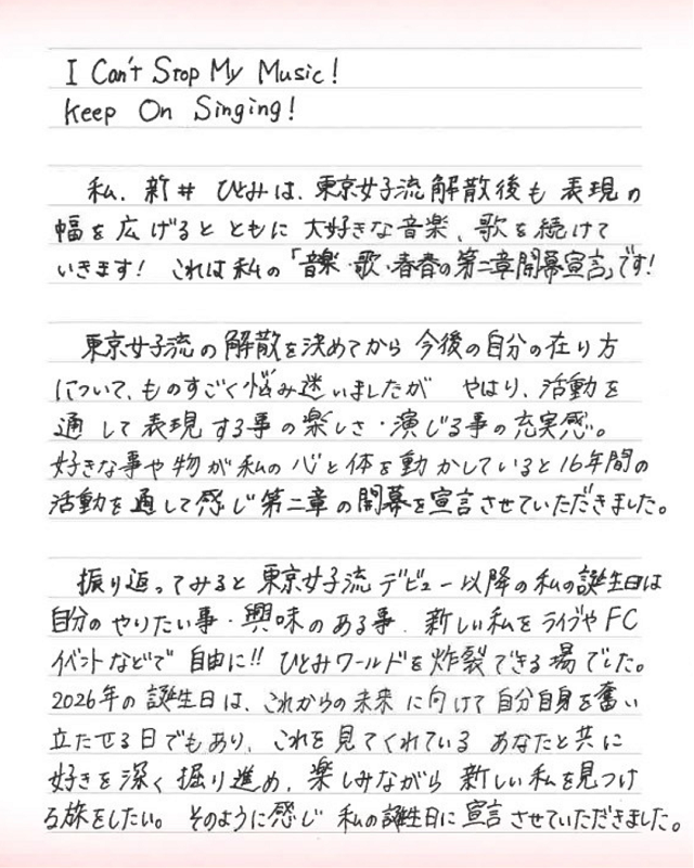 先月31日に解散したガールズグループ「東京女子流」の元メンバー・新井ひとみが、自身の誕生日である4月10日、「音楽・歌・青春 第二章開幕宣言」と題し、音楽活動の継続をInstagramでのライブ配信と、SNSに公開した直筆の手紙で発表した。