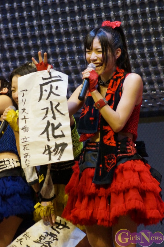 立花あんなさんは「この度、藤崎麻美さんが守ってきてくださったセンターを、この仮面を被ってこれからあんなが、アリス十番のセンターで歌っていきます。アリス十番は去年いろんなことがあって、今のメンバーよりすごく多くて、突然すっごく減ってしまって今の9人になりました。連続のライブをこの9人で乗り越えて、CDデビューもしたり、色んなロックフェスも出させてもらって、いっぱいつらいことがあったけど、この9人でずっと頑張ってきました。私はあんまり人の中心に立って何かをしたりしたことがこの20年間 1度も無かったんですけど、19歳の時にお母さんに無理を言って芸能界に入って、お母さんにアリス十番をやってることとか詳細を言ってなかったんですけど、今回センターになってユニットの中心となったので、お母さんにしっかり見せたいと思います。そして私がアリス十番のセンターになれたのは支えてくれてる皆さんのおかげです。本当にありがとうございます。今まで麻美さんがずっと引っ張ってきてくれたアリス十番を無駄にしないように私がちゃんとセンターでアリス十番が絶対良くなるように、みんなに認められてもらえるように頑張るので、これからも変わっていく新生アリス十番をよろしくお願いします。」と、抱負を語った。