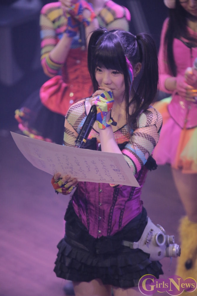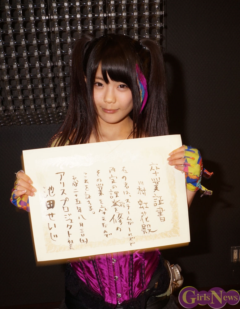 最後に川村虹花さんは「こんなに見てくれるファンの方がいて本当に嬉しいです。朝、P.A.R.M.Sに入ってまず見えたのは7色のお花で風船もサイリウムも全部虹色にしてくれて、自分の名前に虹が入ってて良かったなと思いました。すごい素敵な卒業式をありがとうございます。とうとう今日卒業して明日からはアリス十番です。私がアリスプロジェクトに入ったきっかけはアリス十番でした。私は人と違うことがしたくて、偶然見つけていろんなアイドルがいる中、ヘドバンをしたりダイブしたりボートに乗ったり、他のアイドルとは違うなと思って、絶対アリス十番に入りたいと思ってアリスプロジェクトに入りました。ずっとずっと追いかけてた夢。2階席で上からアリス十番を眺めてダンスの練習をしたりして、やっとアリス十番に入れます。とても嬉しいです。でも、それ以上にスチームガールズ卒業することがとても悲しいです。とても寂しいです。今日で同じステージに立てない・・・。すごく矛盾してるけど、すごく悲しいです。皆でケンカしたり・・・皆で笑いあったり・・・どうやったらアリス十番に勝てるとか毎日のように話し合ったり、全部が素敵な思い出です。私にとってスチームガールズは青春そのものです。すごく誇りに思っています。私は、スチームガールズを代表するつもりで明日からアリス十番になります。すごくメンバーと離れるのは寂しいけど、でもここは成長して自分なりにこれから頑張っていきます。これからもスチームガールズを卒業してもアリス十番としてステージに立つので川村虹花を応援よろしくお願いします。」と語り、スチームガールズのトレードマークとなるスチームガンを発射。ガスマスクを床に置きスチームガールズを卒業した。