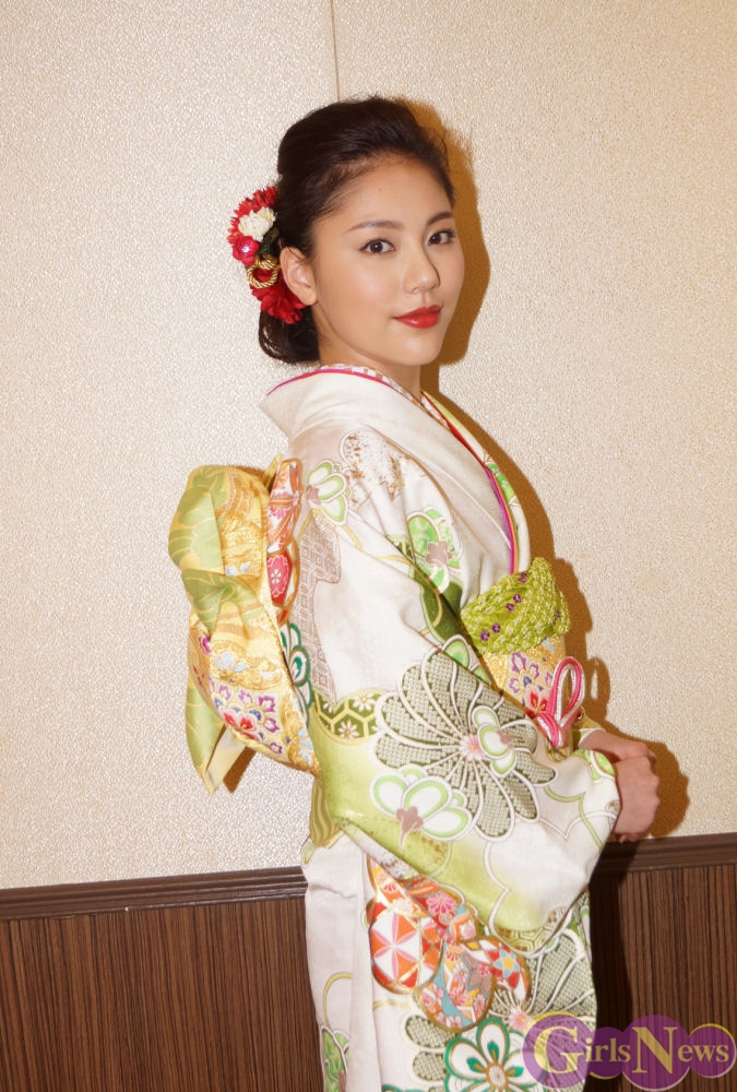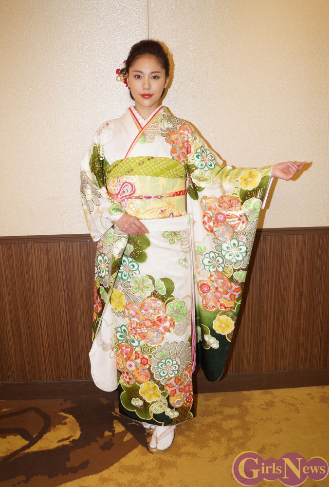 水沢エレナさんがこの日着たのは白地の晴れ着。「白地に緑という結構珍しい色味と柄なんですけど、緑が大好きなのでとても気に入っています。すごく鮮やかな色で、気分も上がるというか、わくわくします」と、着物の持つパワーに元気をもらった様子だった。