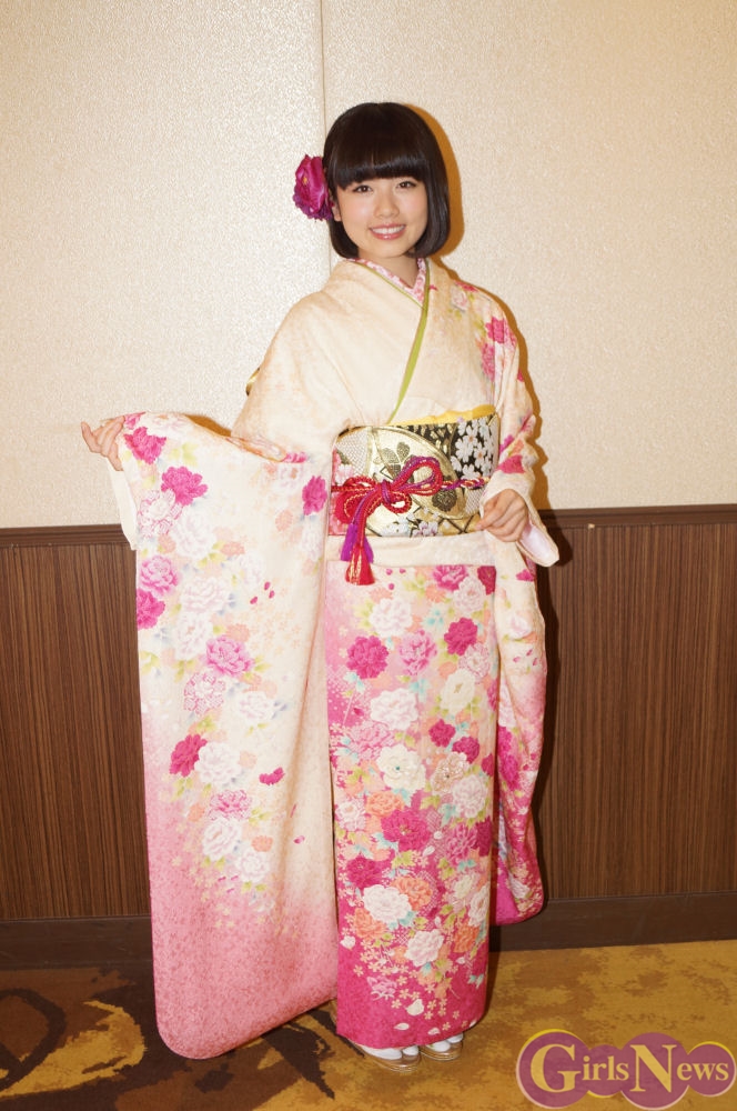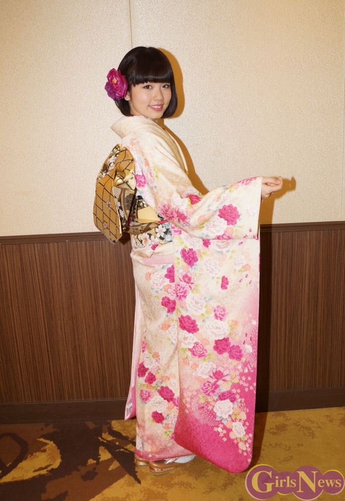 今回の晴れ着について「色味もそうなんですが、全体的に襟元とかに小さい桜がいっぱいあって、大きなボタンの花もたくさん描かれていて、相対的にかわいいんですけど帯は黒とゴールドで、すごく引き締まっているので、すごいメリハリがしっかりしてて、綺麗なお着物だなあって思います」と解説してくれた小芝風花さん。昨年は「きものクイーンコンテスト2014」でスペシャルサポーターを務めるなど着物と接することが多い一年だっただけに、「やっぱり毎年思うんですが、お着物着ると身が引き締まるというか、自然に背筋も伸びるし、歩き方もお上品にというか女性らしくなってる気がしてます。気がしてるだけかもしれないんですけど…やっぱり、気が引き締まります」と日本の伝統の素晴らしさを語った。