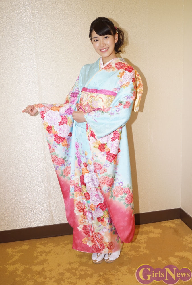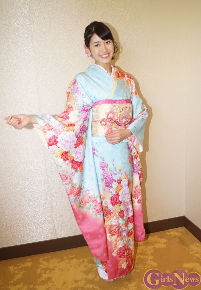 今回の晴れ着について、「バラとボタンのお花の色合いがとてもきれいだなと思うのが一つと、すごく和風っていうより洋風、洋感覚のあるお着物で、すごく今っぽいお着物だなあっと思います」と応えた小澤奈々花さん。「お着物って背筋がピンと張るような感覚があって、すごい姿勢が正されるというか、そんな感じがします」と、着物の持つ独特の力に心を動かされている様子だった。