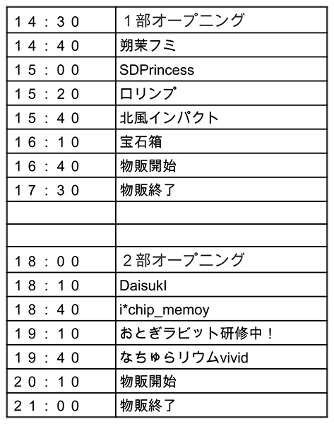 今回の出演者は、SDPrincess、宝石箱、DaisukI、北風インパクト、i*chip_memoy、おとぎラビット研修中!、朔茉フミ、なちゅらリウムvivid、ロリンプ♡(順不同)の9組。