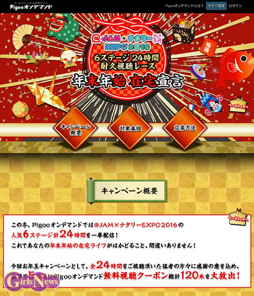今回、各ステージを合わせて24時間に上る大変ボリューミーな配信となっており、キャンペーン期間中に全コンテンツを視聴した”在宅”の方々を対象に、オンデマンド無料クーポンが総計120本当たるユニークな企画「Pigoo オンデマンド @JAM×ナタリーEXPO2016 6ステージ 24時間耐久視聴レース!年末年始在宅宣言」も行われる。この年末年始、スマホを片手にひたすらアイドルを楽しむ”在宅”という楽しみ方が再評価されるときが来たのかもしれない。応募方法の詳細は特設ページを確認されたい。