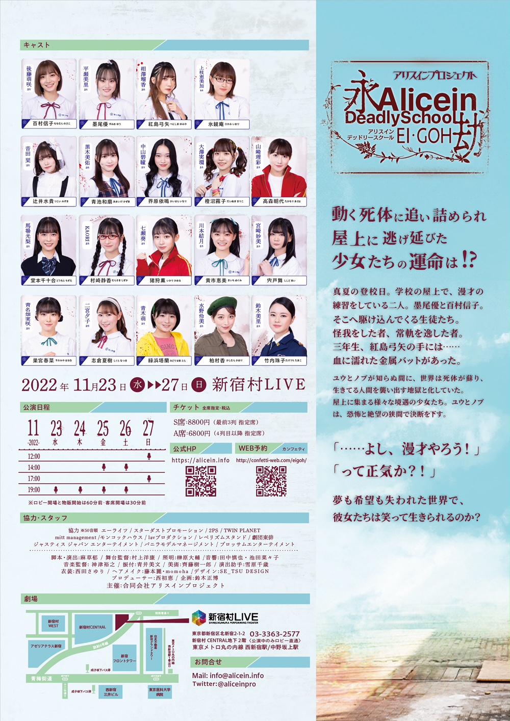 2022年11月23日(水・祝)~27日(日)東京・新宿村LIVEにて、ガールズ演劇カンパニー・アリスインプロジェクトの舞台「アリスインデッドリースクール 永劫」が上演される。