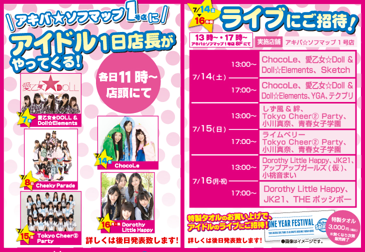 7月7~8日と7月14日~16日、アキバ☆ソフマップ1号店の1周年を記念して、人気アイドルによる一日店長イベントの開催が決定した。