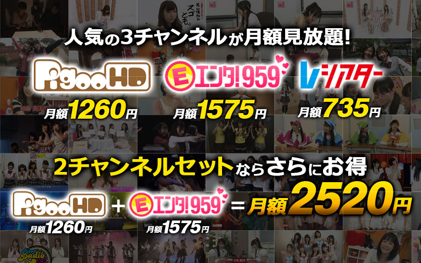 現在サイトオープンを記念して、PigooHDでの人気番組「GirlsNewsハロプロ」「ミルキィホームズの特別授業」や、エンタ!959の人気番組「かすみレディオ」「プレミアムグラビア」など#1を中心としたラインナップが、なんと40番組以上見放題となっている。