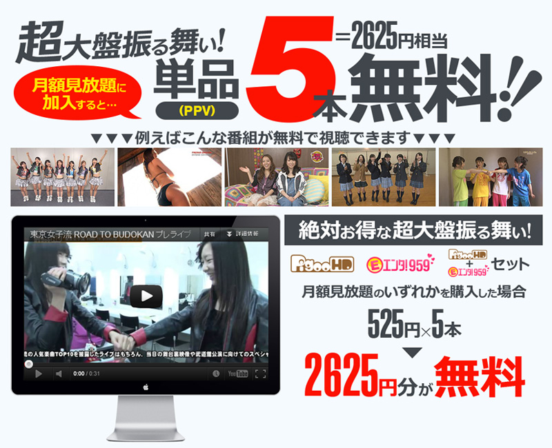 ※2012年12月7日の時点で月額見放題に加入しているユーザーと、2012年12月7日~2013年1月7日までに月額見放題に新規加入したユーザーのみ、単品動画(PPV動画)が5本無料で視聴可能。