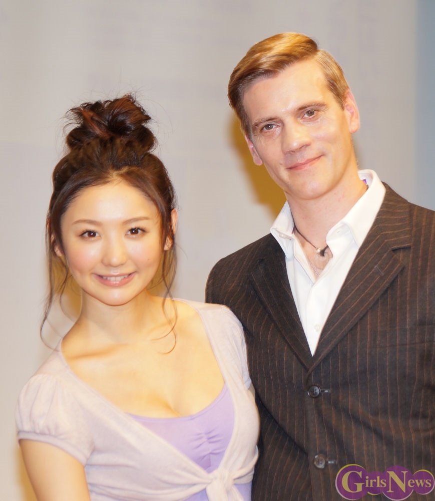 会見の途中には、このミュージカルのオフィシャルサポーターを努めるタレントのおのののかさんがレインコート姿で登場。7月22日が誕生日のアダム・クーパーさんに花束を渡し、バースデーソングで祝福した。