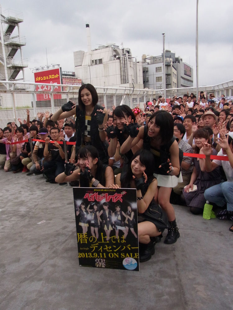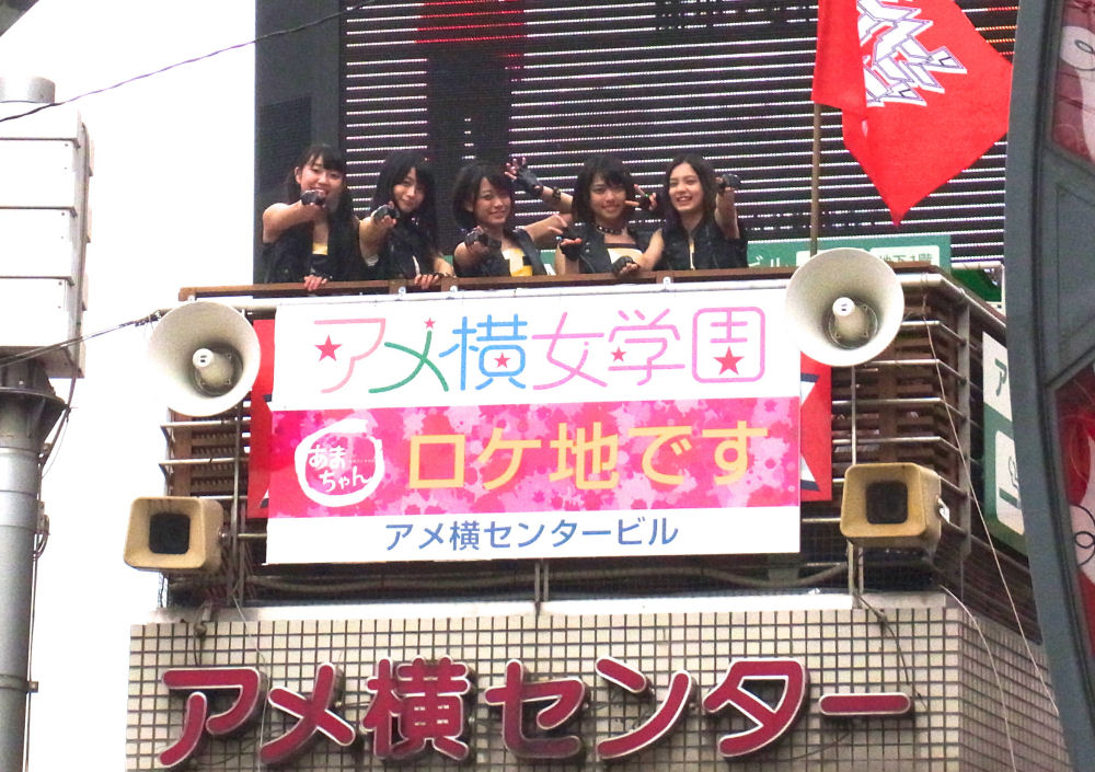 乗り込み!乗っ取り!!アイドルとして活動中の5人組アイドルグループ・ベイビーレイズが8日、NHK連続テレビ小説「あまちゃん」に登場する架空のアイドルグループ「アメ横女学園」の本拠地である、「上野アメ横センタービル」の屋上にて限定ゲリラライブを行った。