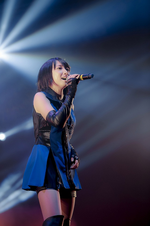 インドネシア語を交えたMCで会場を沸かせつつ、「MEMORIA」(「Fate/Zero」1stシーズンED)、「INNOCENCE」(「ソードアート・オンライン」2ndシーズンOP)や、YUIのカバー「GLORIA」など、全8曲の熱いステージで会場を魅了した。