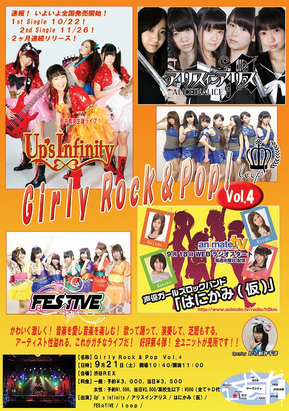 過去3回のシリーズも出演数が少ないながらも、毎回約100名の集客をし、不定期開催ながらも、定着してきたのではないか?今回の出演陣は、このライブの軸となる、アイドル専門チャンネルPigoo(スカパー!プレミアムサービスCh.663)で好評放送中「バンドルseason2」から誕生した、アイドルなのにガチで演奏してガチで歌う、妥協なきバンドアイドルユニット「Up’s Infinity」。10月、11月とデビューCDを2ヶ月連続発売(発売元/GEKIATSU MUSIC JAPAN、販売元/TOWER RECORDS)。全国リリースも決定し、今後の展開が楽しみなユニットです。また、この日はギターの田中真央の18歳をお祝いした生誕ライブでもあるとのこと。そしてアイドル演劇カンパニー「アリスインプロジェクト」から誕生した、アクトライブアイドルユニット「アリスインアリス」。メンバーが全員2期に入れ替わり、新生となってから、始めてメンバー5人が揃うライブということで楽しみです。