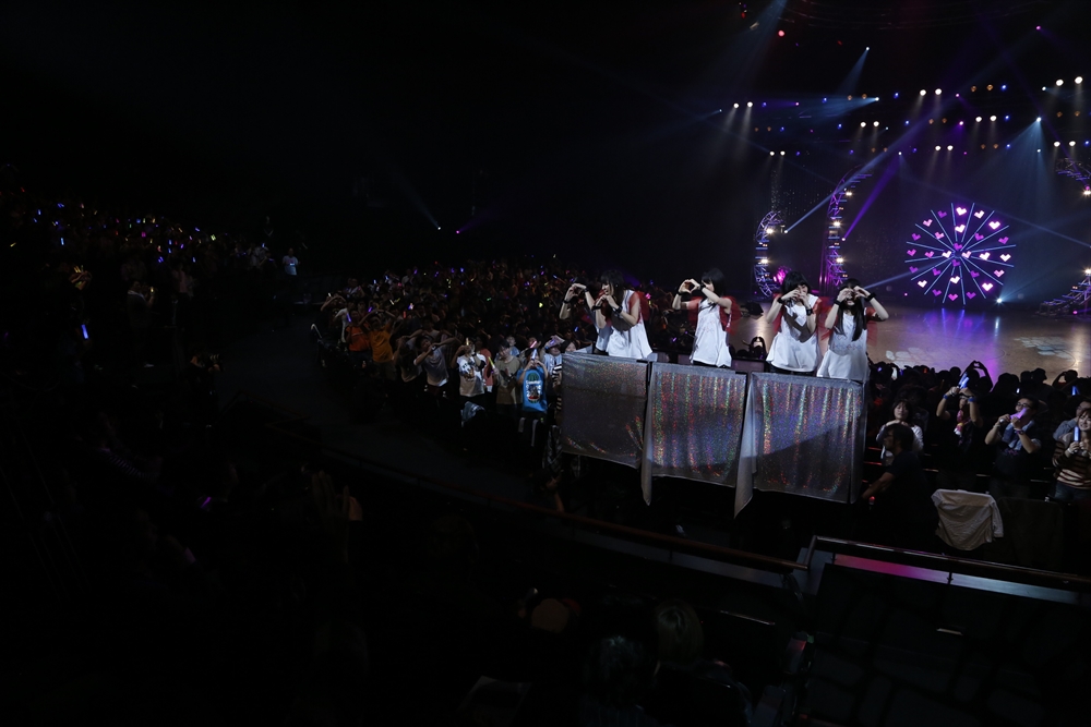 ファンの中でも非常に人気の高い曲ということもあり、頭から最高潮の盛り上がりをみせ、そこから一気に4曲連続披露。「流星のくちづけ」では、突然メンバーがステージから降り、客席内にある通路に置かれた5つのお立ち台の上で歌うというファンサービスも。
