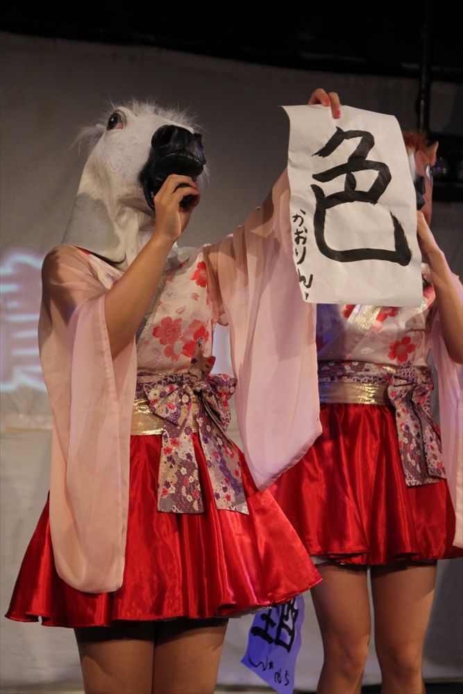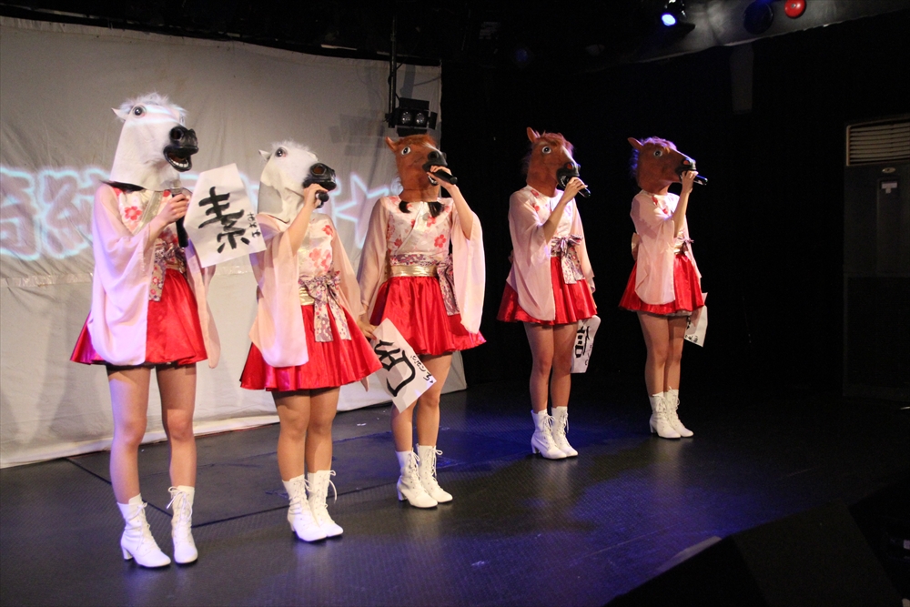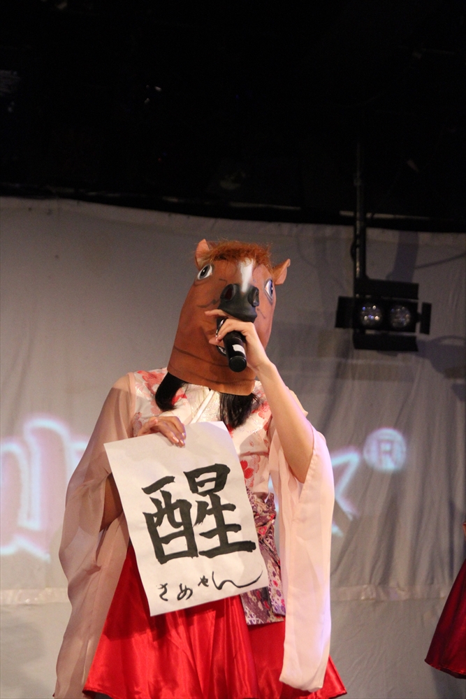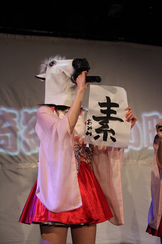 オープニングでは馬と化したメンバーが登場。新年のご挨拶に加え、今年の抱負を書き初めで発表した。アイドルとして「可愛らしさ」だけでなく「滑稽さ」も売りにした彼女達ならではの演出だ。