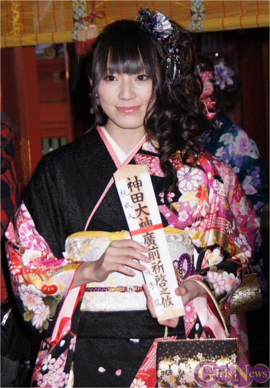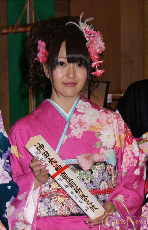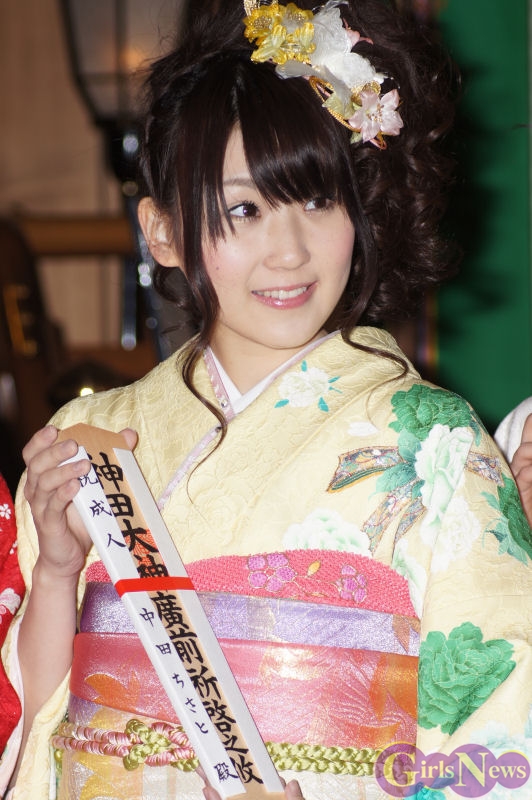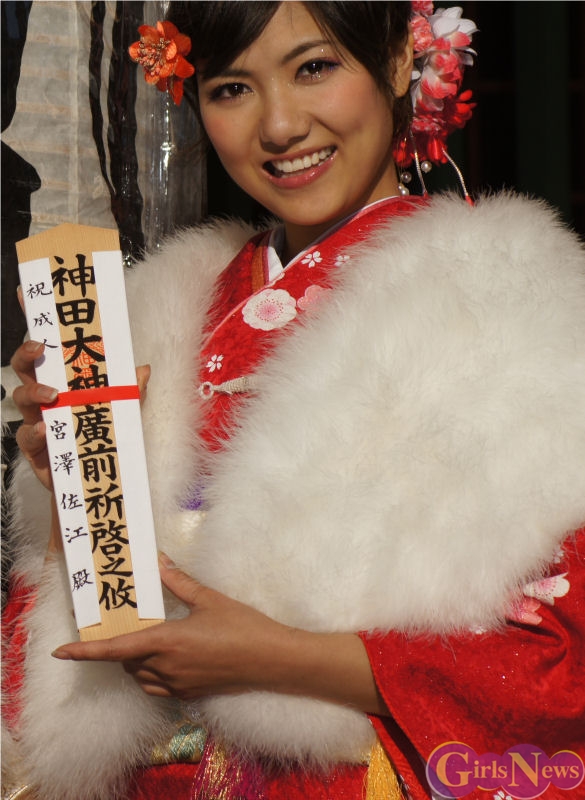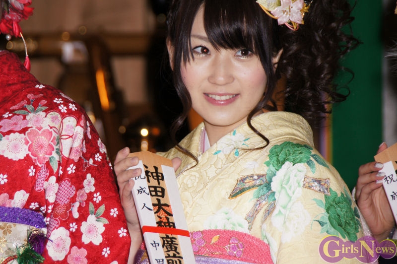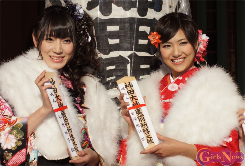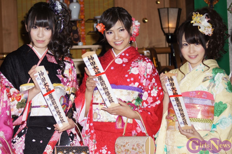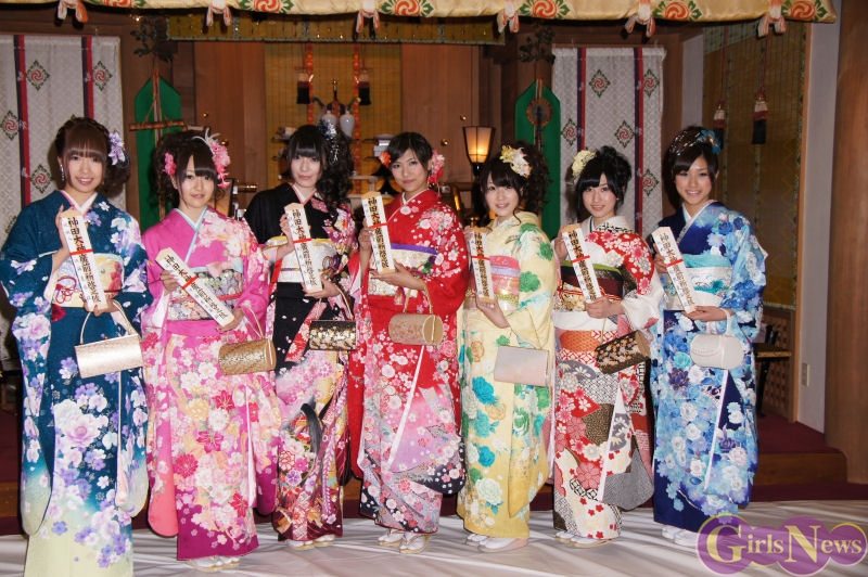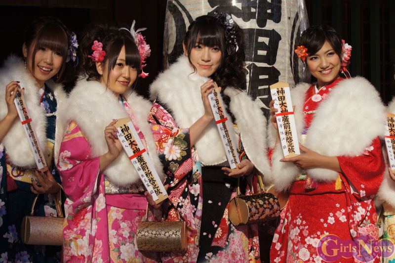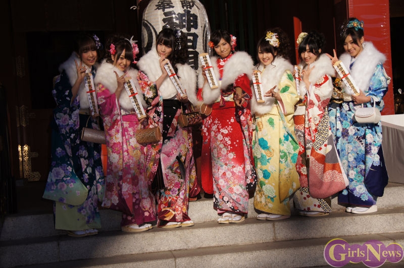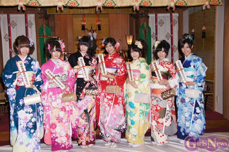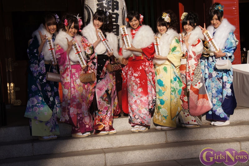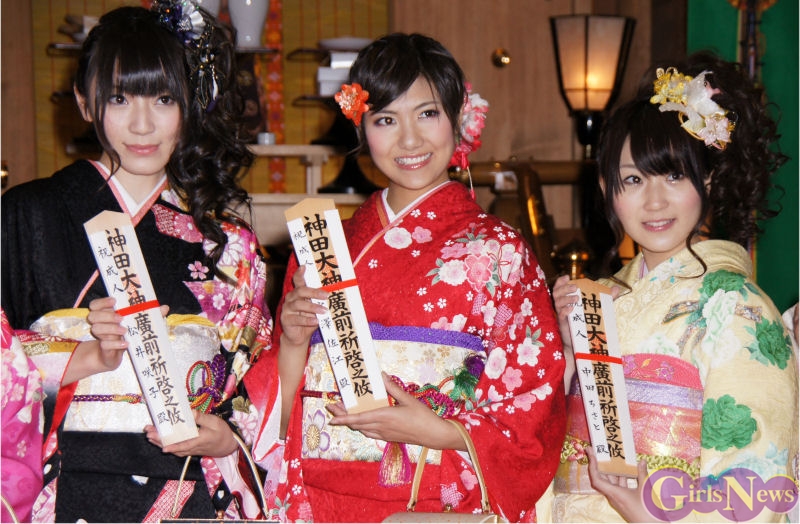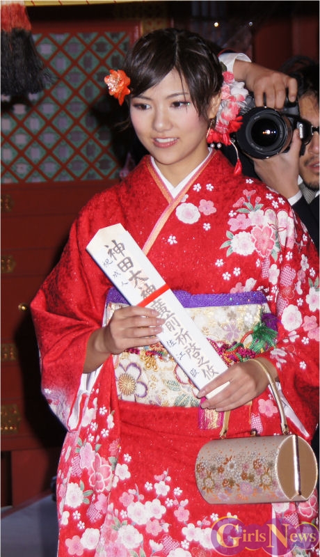 1月10日、AKB48で新成人となったメンバー 宮澤佐江・松原夏海・松井咲子・中田ちさと・佐藤夏希・佐藤亜美菜・片山陽加の7人が秋葉原に程近い 神田明神で成人のお祓いを受けるため振袖姿で参拝した。