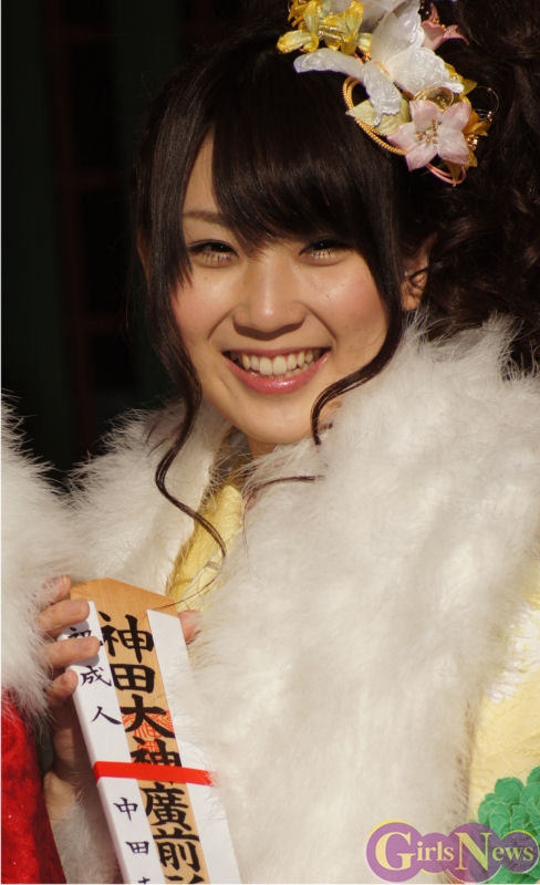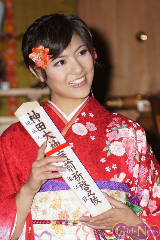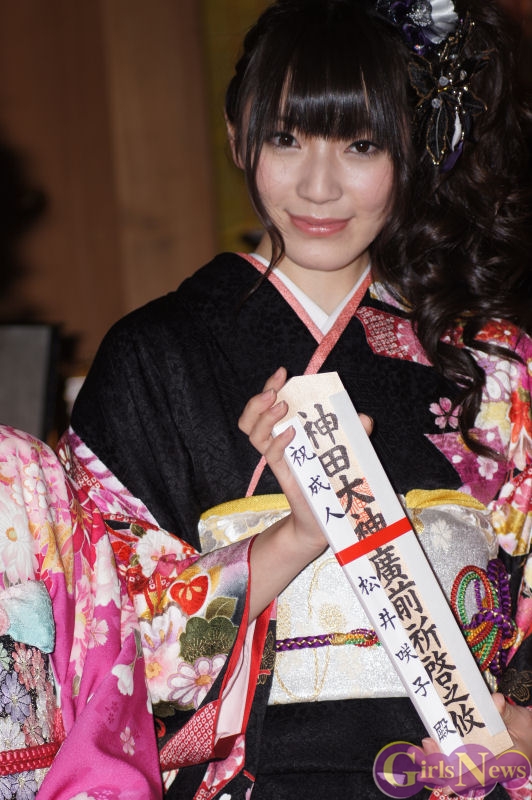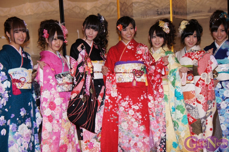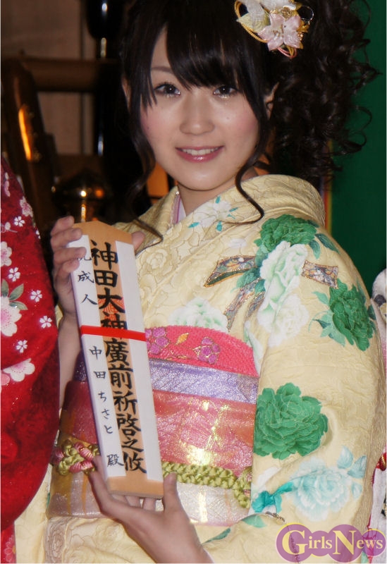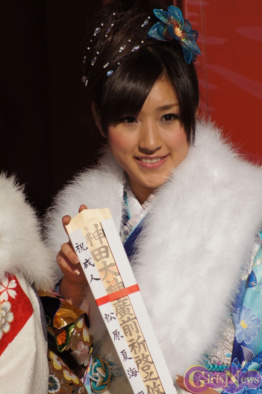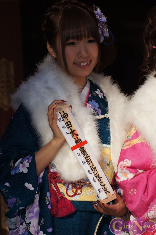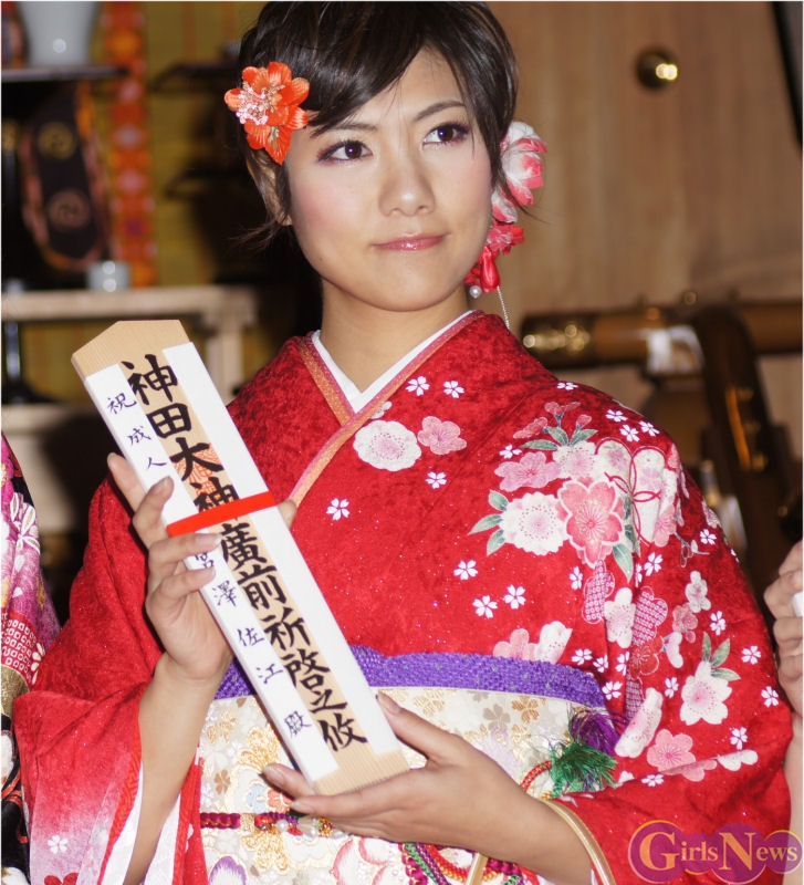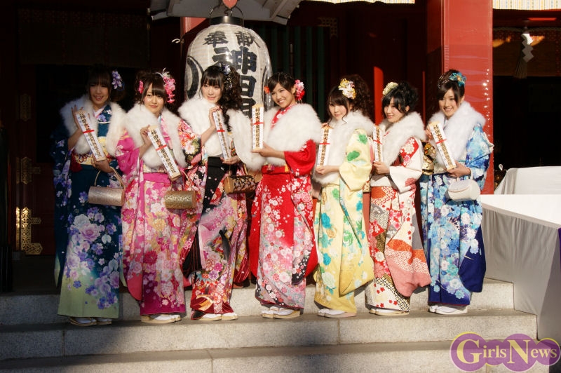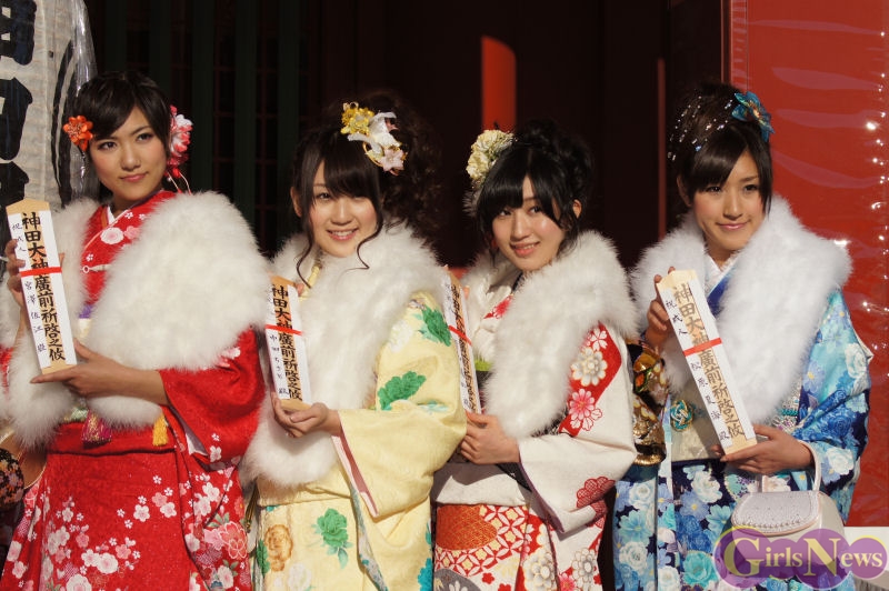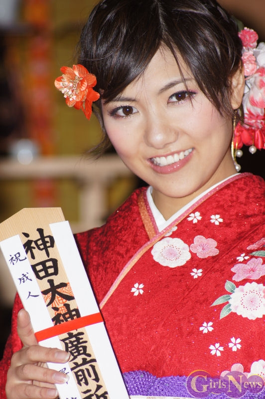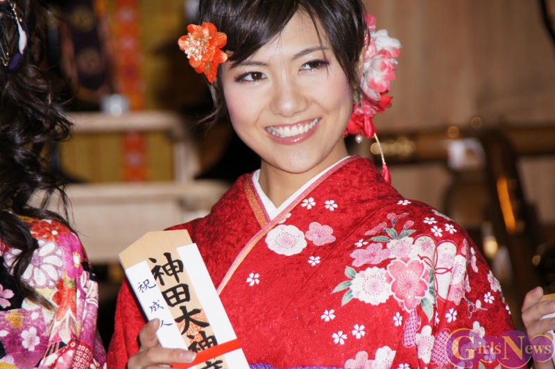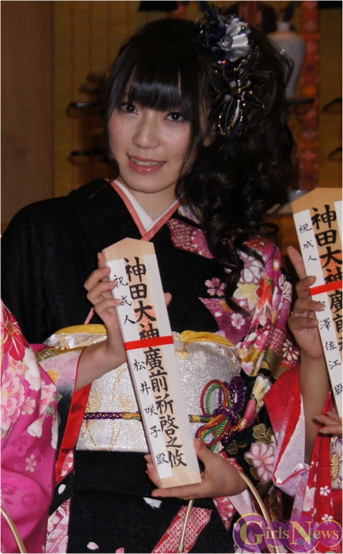 1月10日、AKB48で新成人となったメンバー 宮澤佐江・松原夏海・松井咲子・中田ちさと・佐藤夏希・佐藤亜美菜・片山陽加の7人が秋葉原に程近い 神田明神で成人のお祓いを受けるため振袖姿で参拝した。