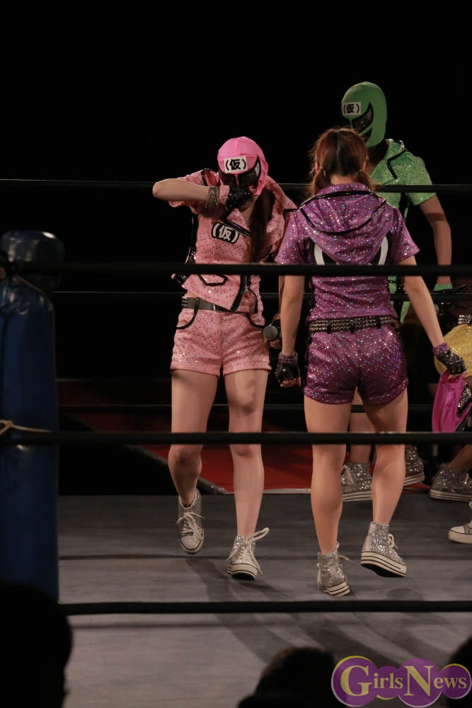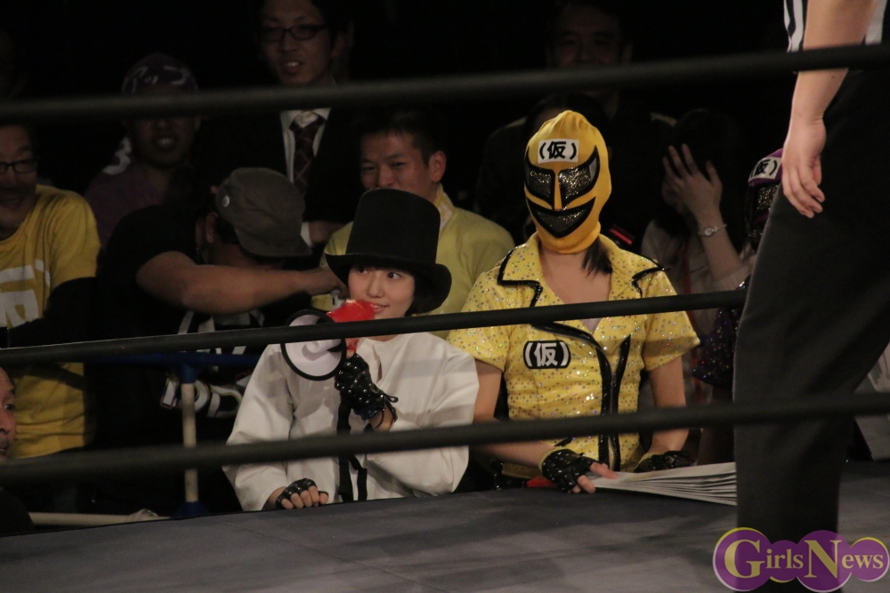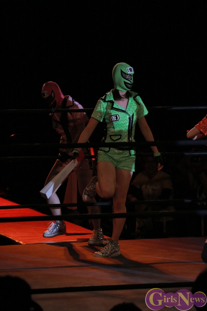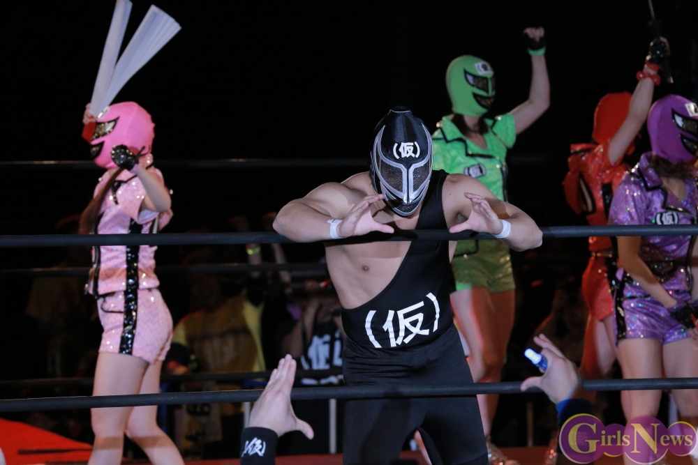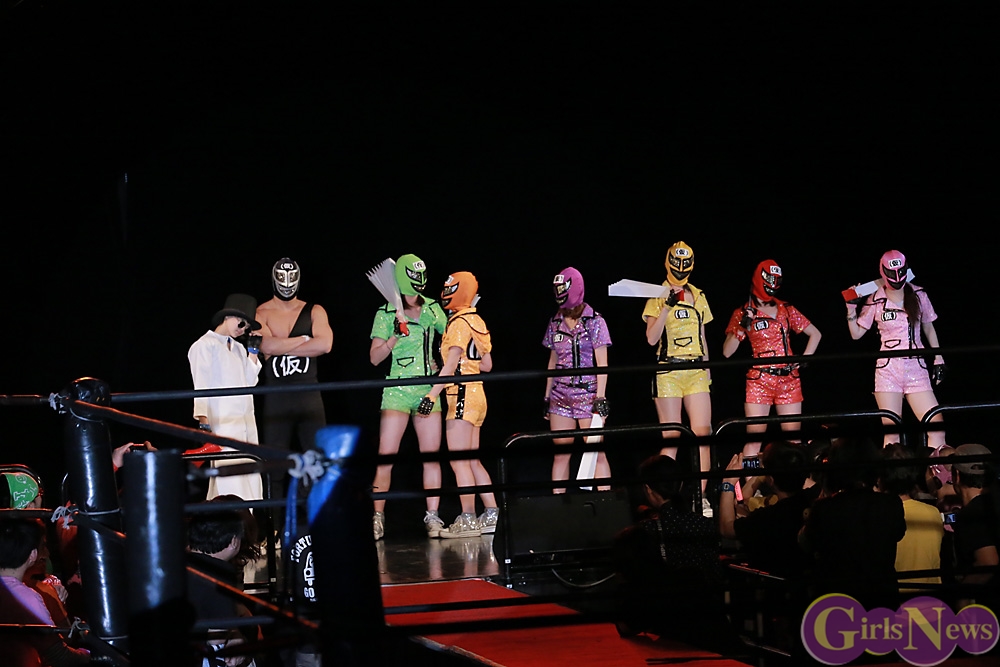 最年少メンバーの新井愛瞳さんに非常によく似た謎の人物、将軍KYまぁながそれぞれメンバーカラーのマスクを被った残りのメンバーを率い、リングに登場。