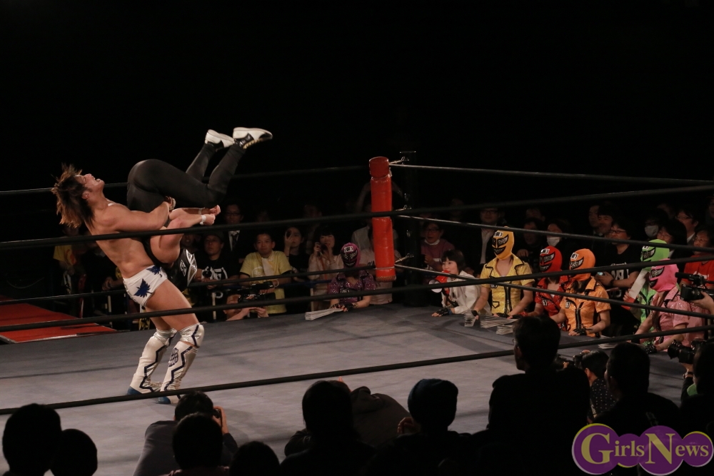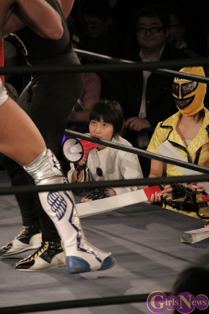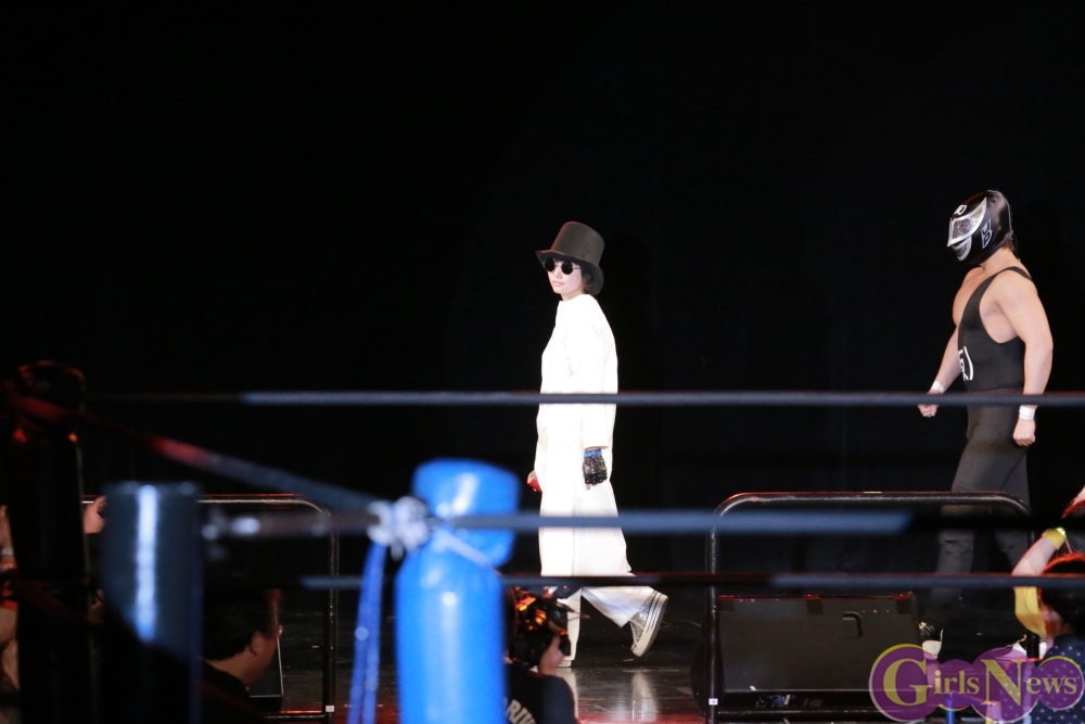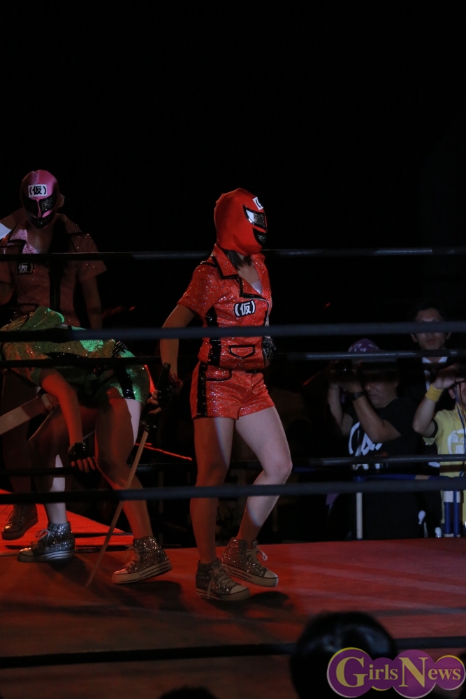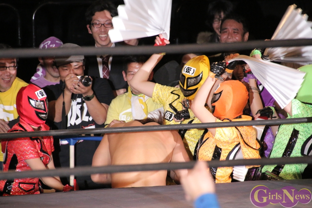 最年少メンバーの新井愛瞳さんに非常によく似た謎の人物、将軍KYまぁながそれぞれメンバーカラーのマスクを被った残りのメンバーを率い、リングに登場。