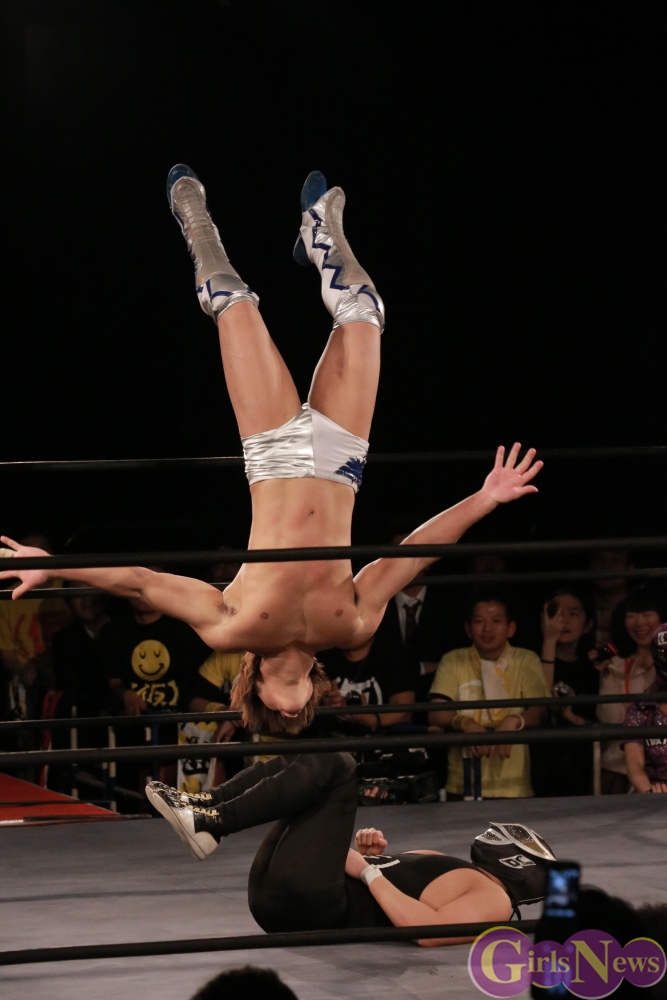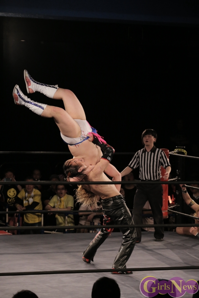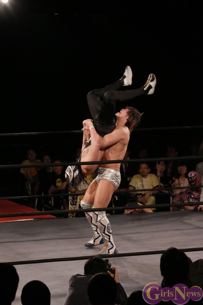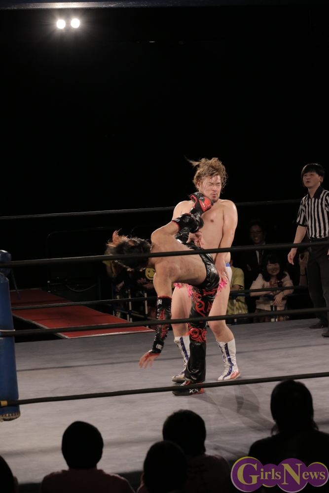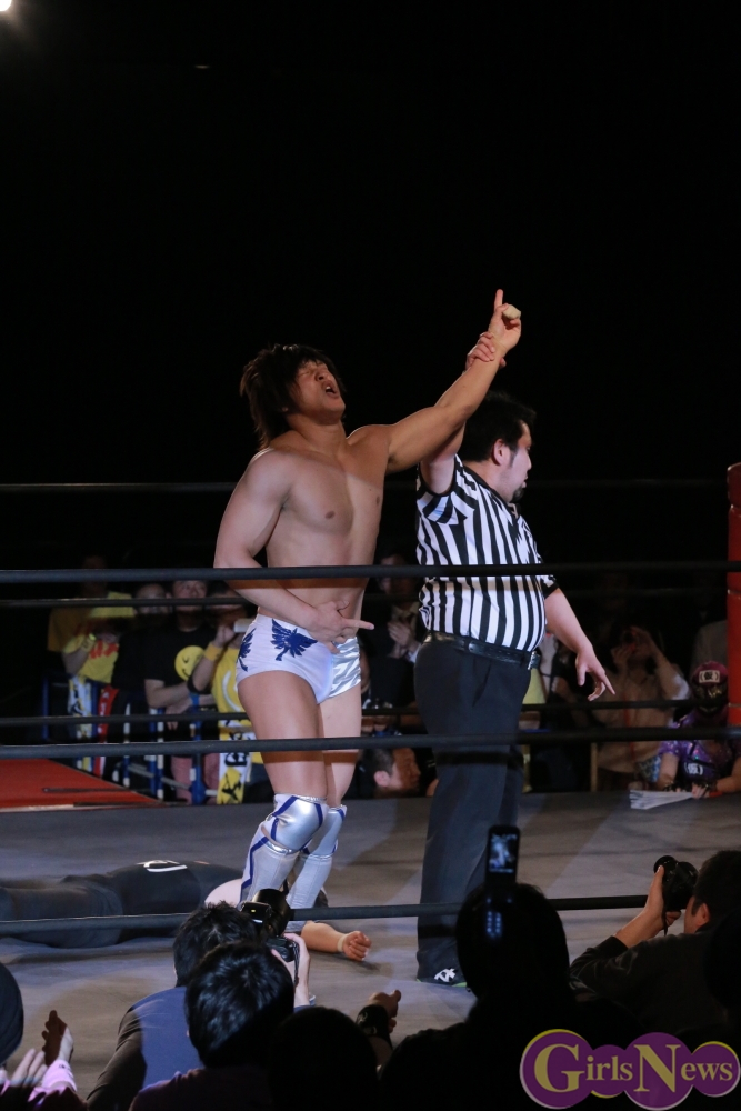 ただでさえ暑い超満員の会場を持ち前の暑苦しさでさらにヒートアップさせた古川小夏さんは二刀流のハリセンで武装した佐保明梨さんと共に飯伏幸太選手を滅多打ちにするなどセコンドとして懸命に援護射撃をしたが、やはり現・IWGPジュニアヘビー級チャンピオンの前には力不足だったのか、会場のあちこちからなぜか「平田!頑張れ、平田」と声をかけられていたアップアップマシン(仮)は惜しくも敗れてしまう。