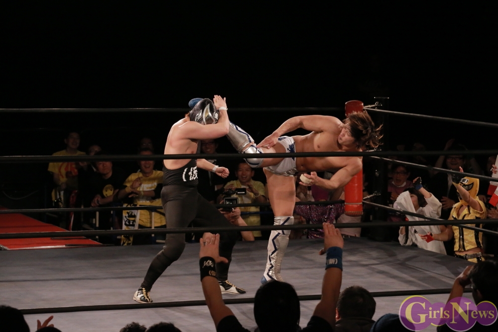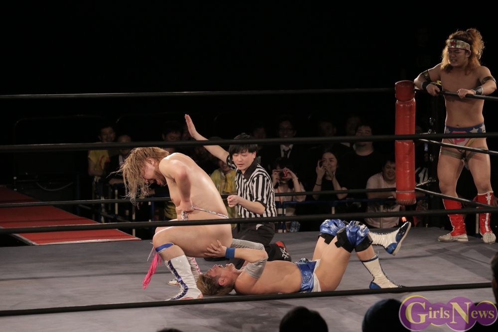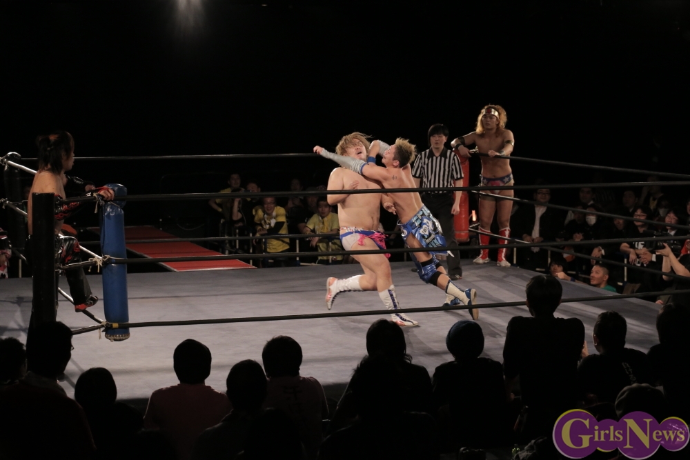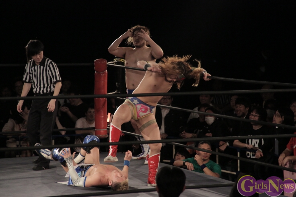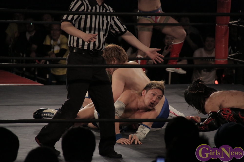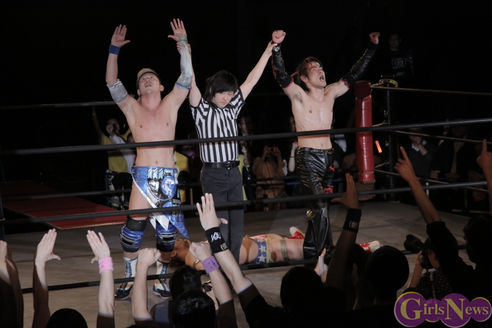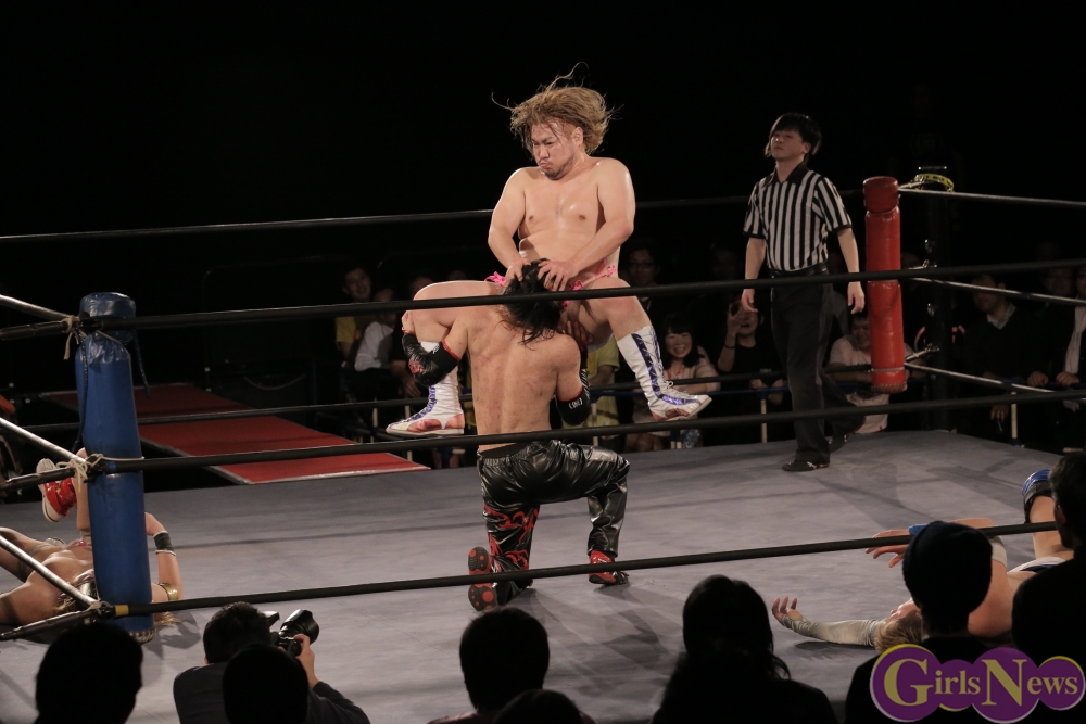 続く第三試合、男色ディーノ・福田洋 vs 大石真翔(仮)・木高イサミ(仮)ではその思いが通じたのか、見事アプガ陣営が勝利を収めた。