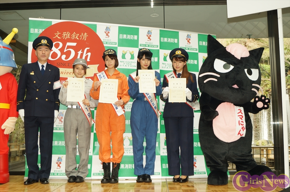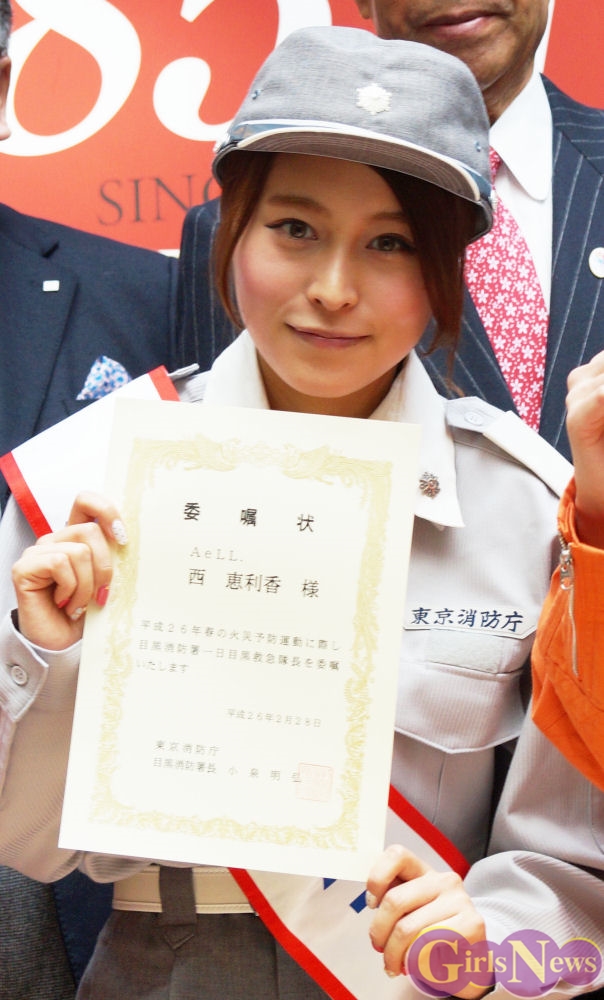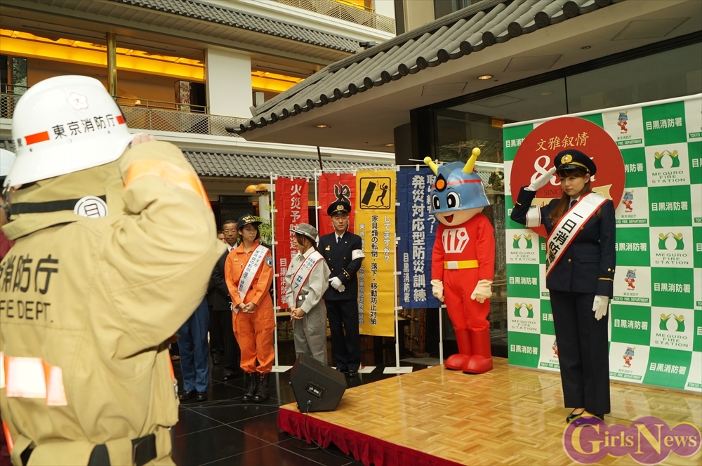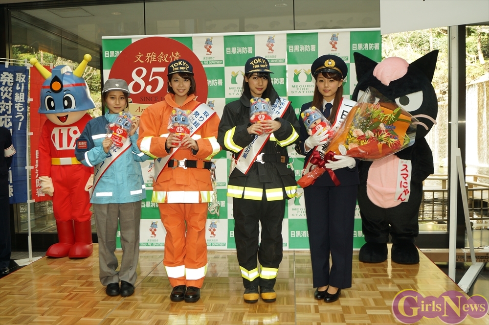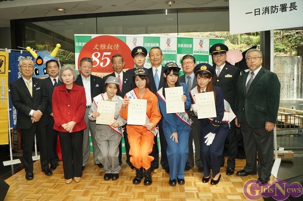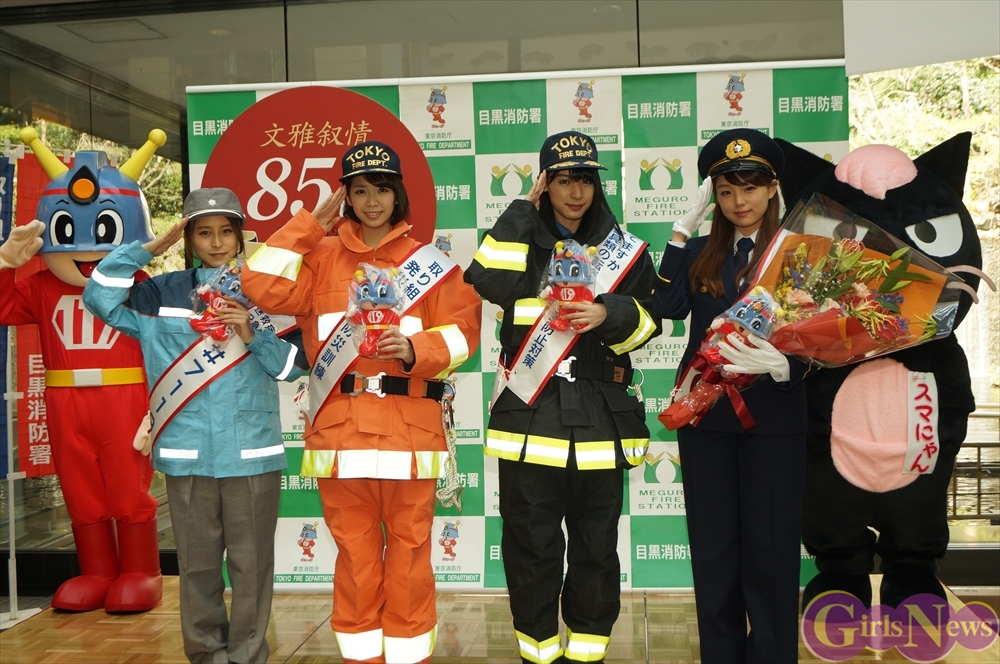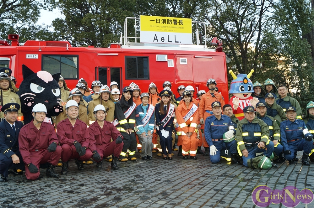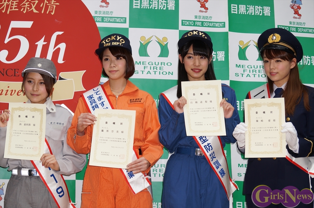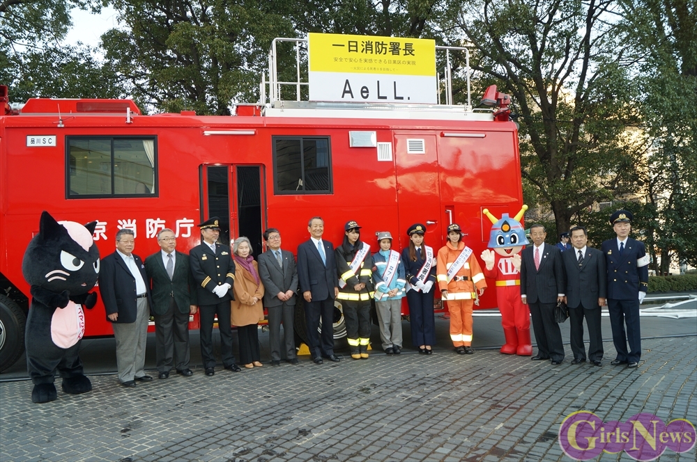 2月28日、平成26年春の火災予防運動を前に目黒消防署の消防演習が目黒雅叙園で行われ、人気アイドルグループのAeLL.の篠崎愛さんが目黒消防署の一日消防署長、石條遥梨さんは一日中隊長、鷹那空実さんは特別救助隊長、西恵利香さんは一日救急隊長に任命された。