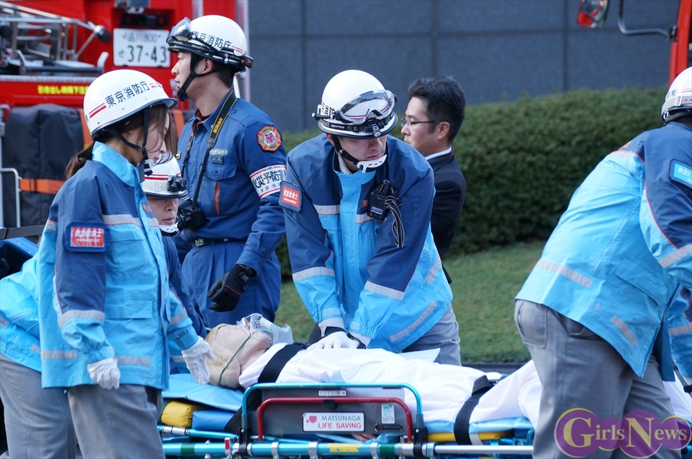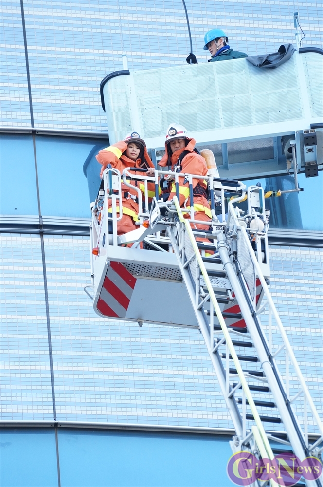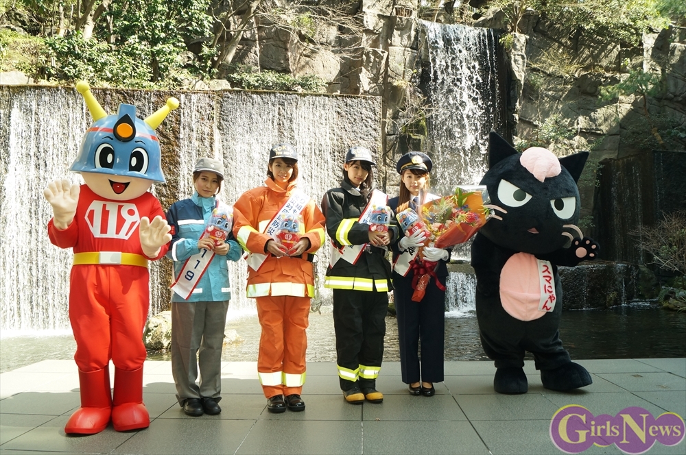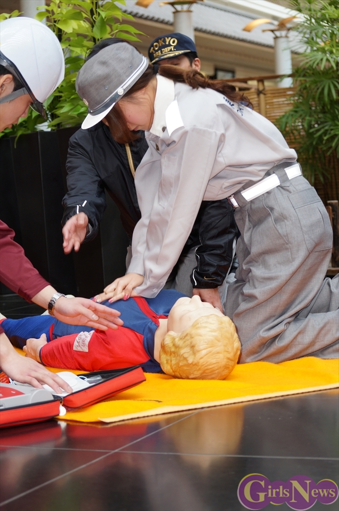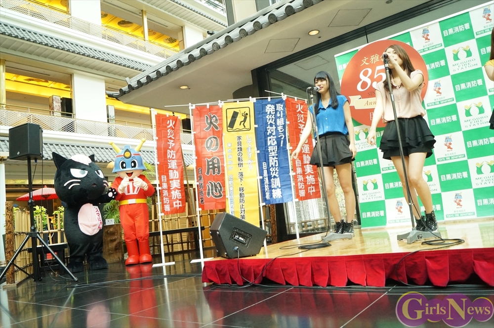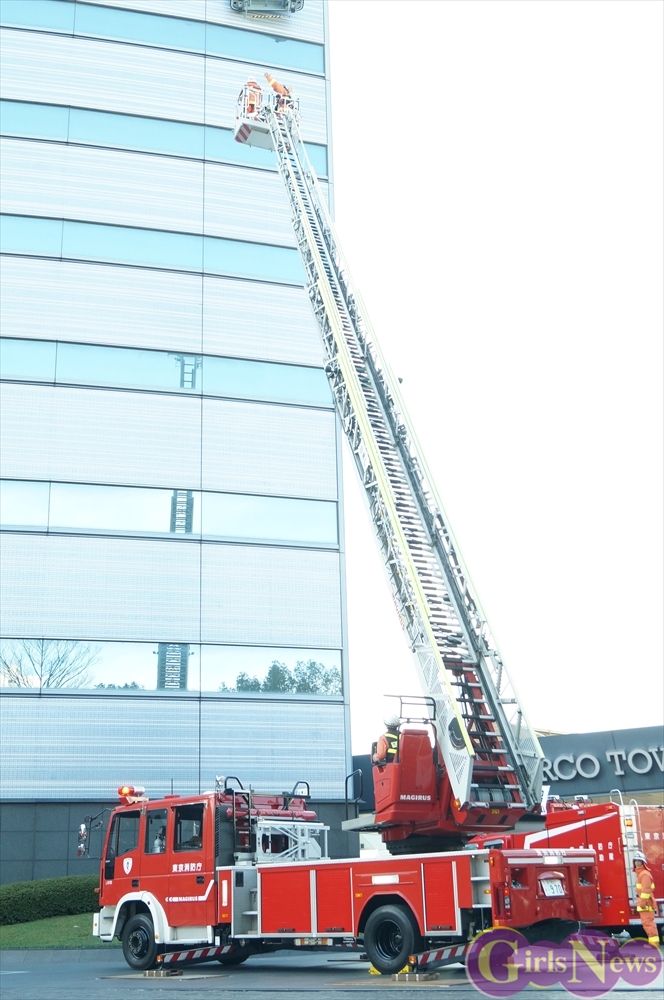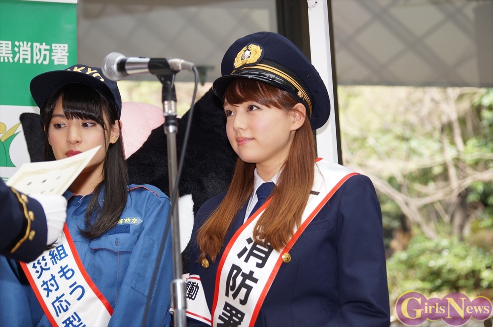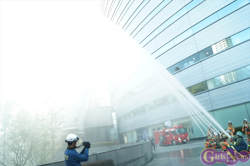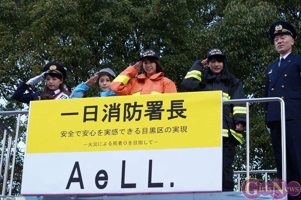 AeLL.の4人は目黒雅叙園の館内で行われた消防演習を視察。目黒雅叙園アルコタワー前では、篠崎愛一日消防署長の「放水始め!」の号令で一斉放水が行われ、目黒消防署の隊員を指揮。