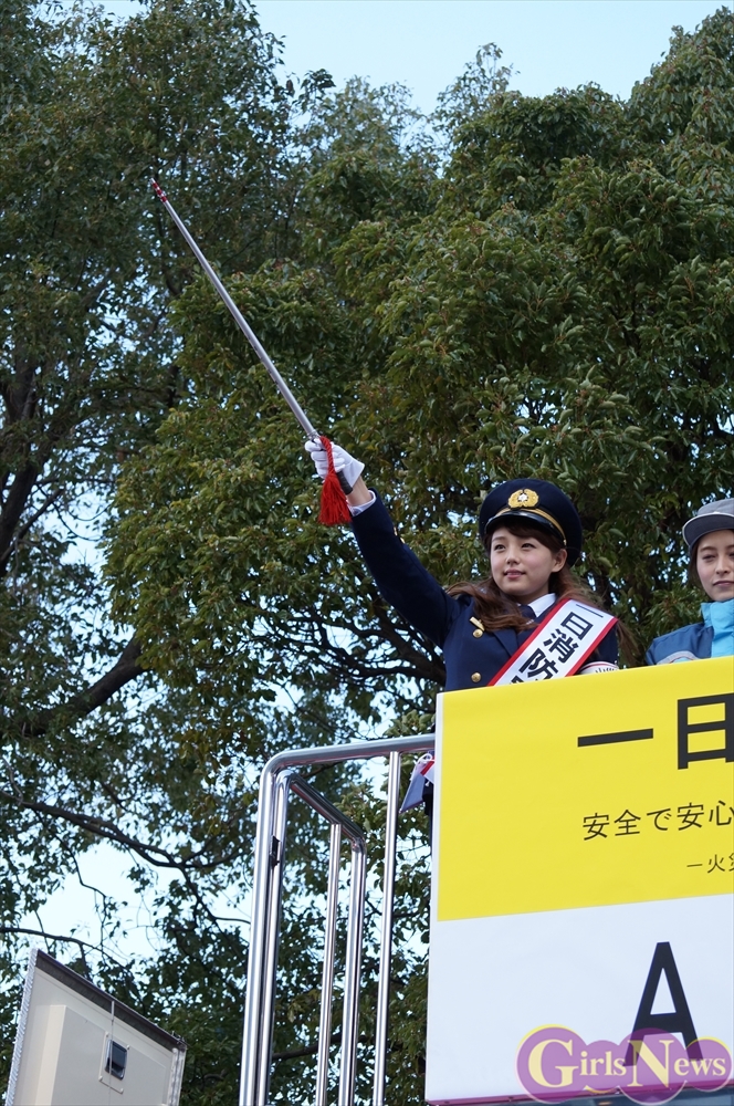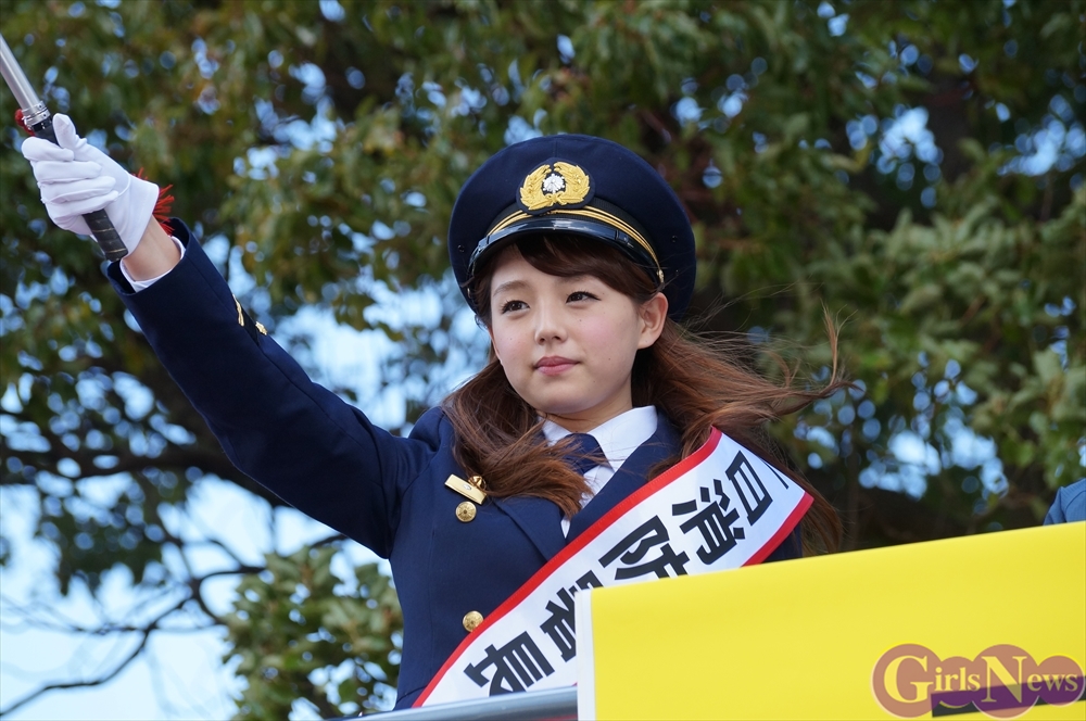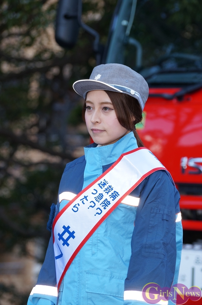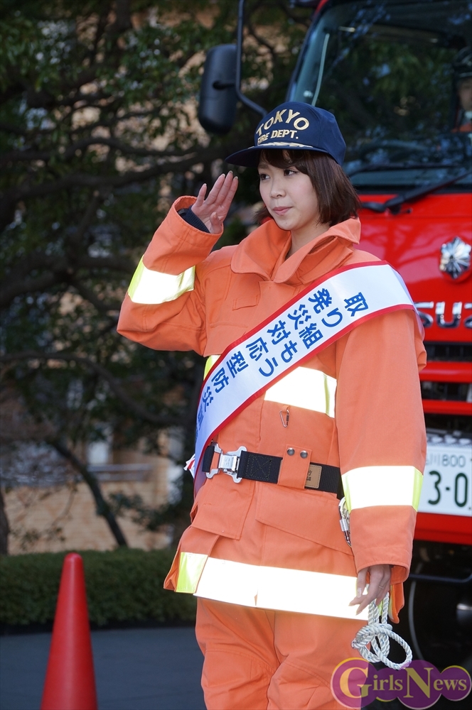 凛々しい制服姿に身を包み登場した篠崎愛さんは「今日は私たちAeLL.4人が消防演習の指揮を執ります。よろしくお願いします。」と挨拶。