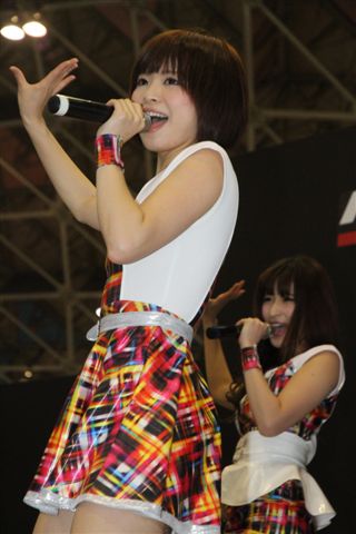 車のイベントには欠かせないコンパニオンも務めている彼女たちにとっては、まさにホーム的なイベントでもあり、ステージ前にはアイドルファン層以外の来場者も多く集まり、ミニスカートやショートパンツ衣裳で美脚全開の彼女たちのパフォーマンスを見入ってた。