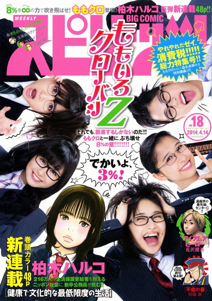 『週刊ビッグコミックスピリッツ』18号は、消費税、最後の5%の日の3月31日に発売。今号では、ももいろクローバーZの5人が「消費ゼ~ット!」と経済評論家の森永卓郎氏と一緒に、消費税についてお勉強。