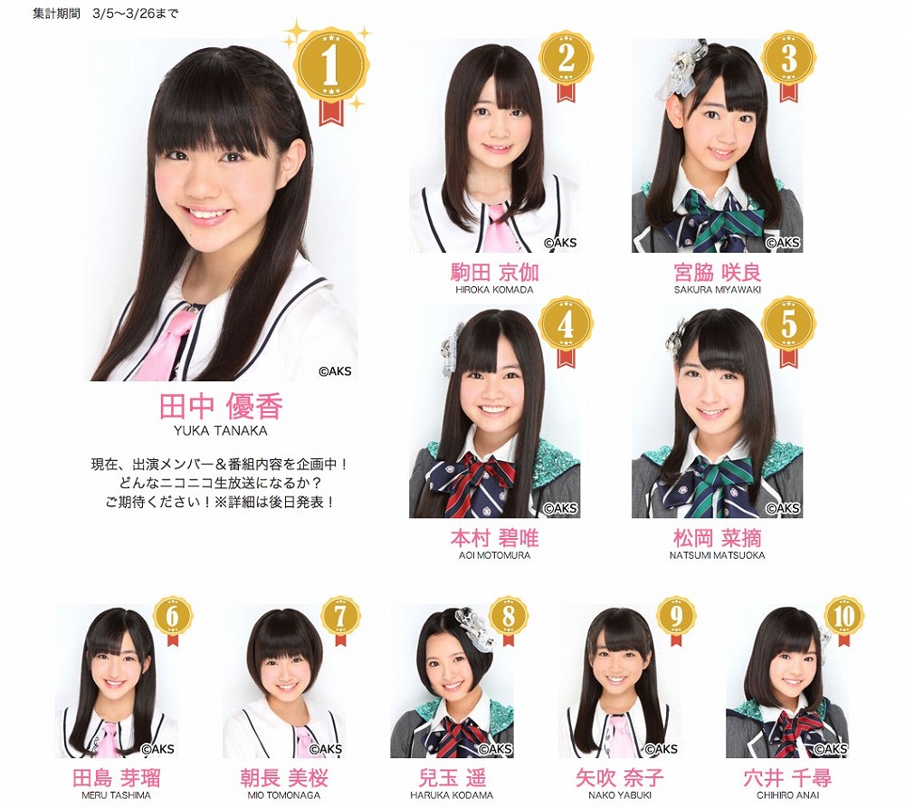 中間ランキングでの首位をキープした田中優香さん、そして2位となったのは、こちらも研究生の駒田京伽さん。1週目、2週目の中間発表では10位圏外だったものの、最終週では2位に!駒田京伽さん自身のブログ(Google+)にて『ニコニコ生放送に出たい!』と毎日アピールを続け、その思いにファンが応えた結果となった。