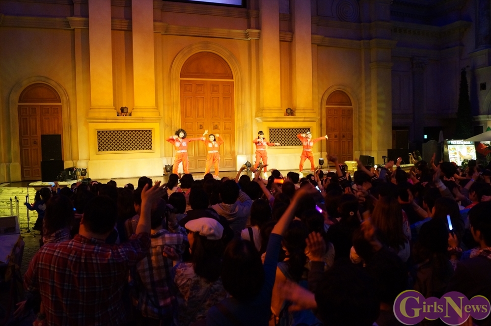 パンビナッ!のピンクのつなぎの衣装で登場した4人は、最初に「Everybody’s Gonna Be Happy」を披露。Prizmmy☆は小学生の女の子のファンも多く、黄色い声援が送られる。