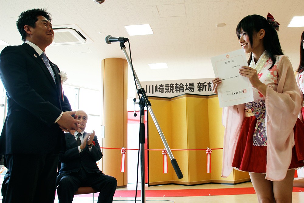 この日は川崎競輪場の新施設完成を記念した式典が開催され、川崎市長、副市長、JKA会長、市議会議長をはじめ川崎政財界を代表する要人が列席した。その式典の中で福田紀彦市長から川崎純情小町☆に委嘱状が贈呈され、川崎競輪のイメージキャラクターに就任した。