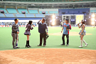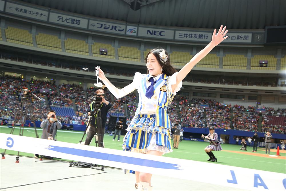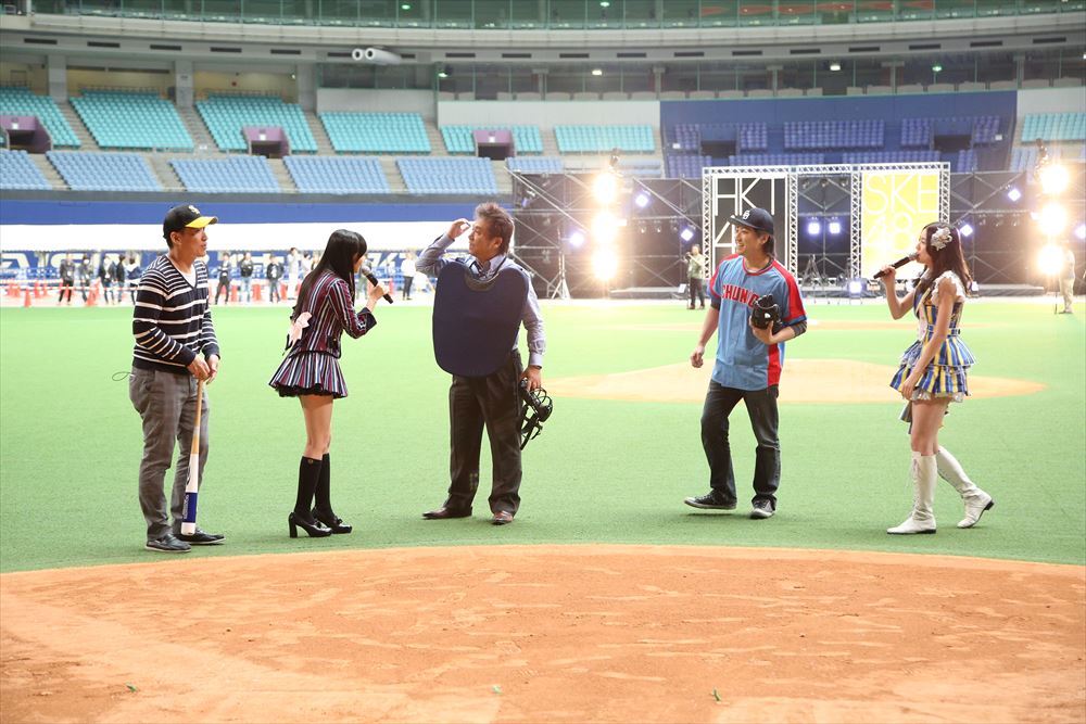 続いて、初の合同握手会を記念した始球式が行われ、ピッチャーをSKE48劇場支配人研究生・芝智也氏、対するバッターをHKT48劇場支配人・尾崎充氏、そして審判をSKE48劇場支配人候補生・今村悦朗氏が務めた。各グループのメンバーやファンからの大声援を受けて、形式的な始球式とは違ったガチの対決ムードに。芝支配人の渾身のストレートを尾崎支配人がフルスイングするも空振りし、今村支配人が「ストライク!」とコールすると、球場は大盛り上がりとなった。
