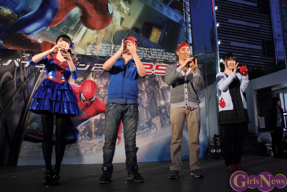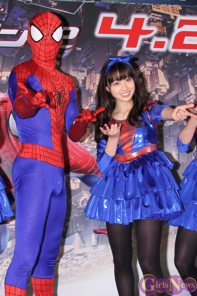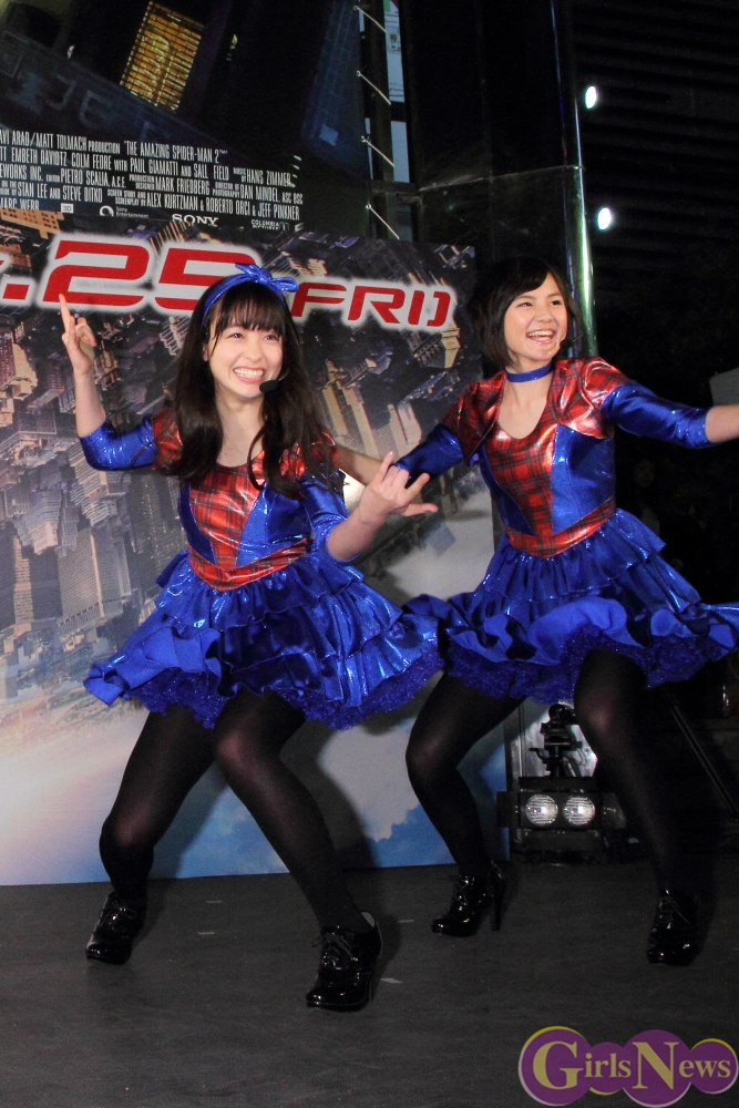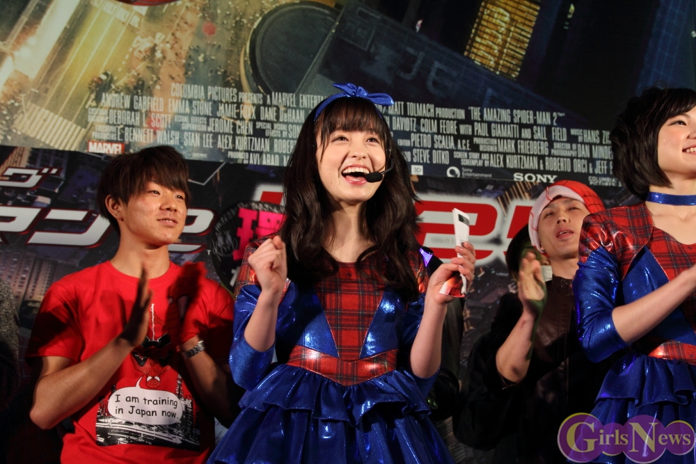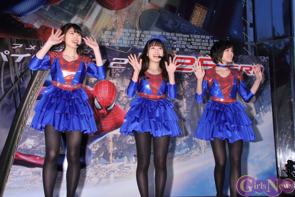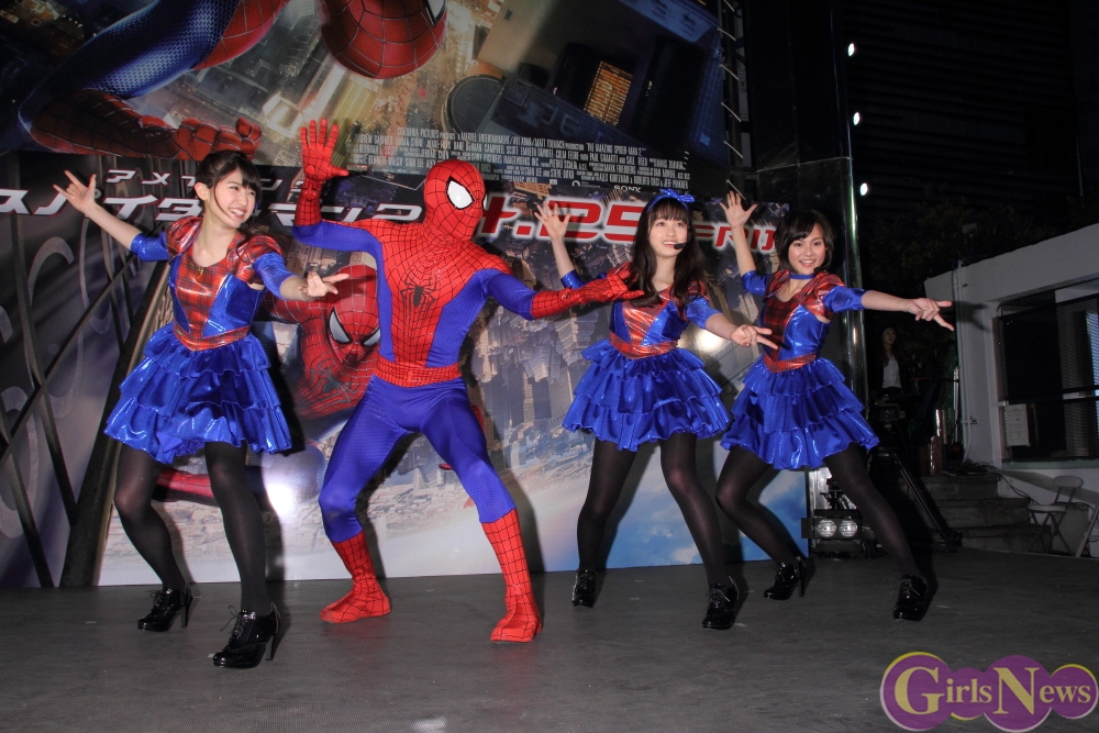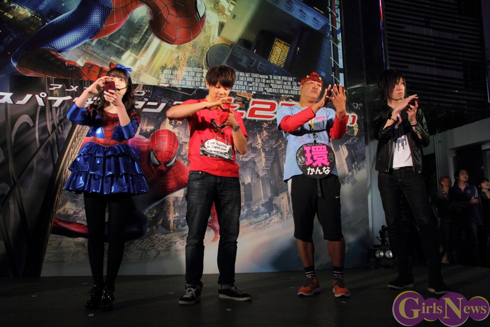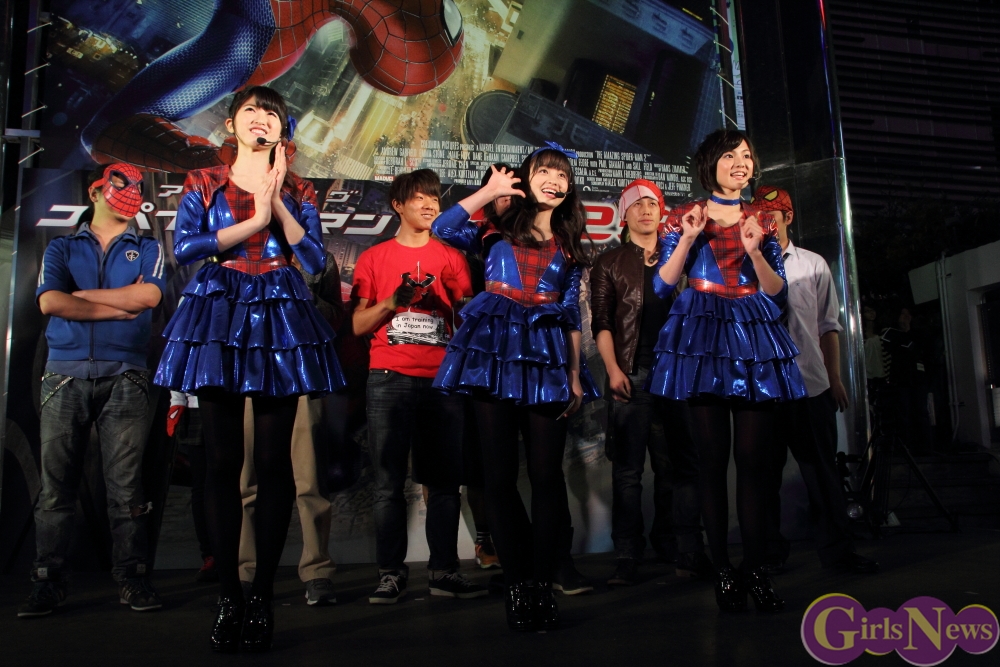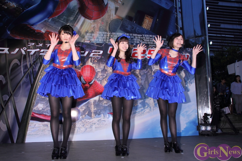 4月24日、映画『アメイジング・スパイダーマン2』の公開を記念した前夜祭イベントが新宿ステーションスクエアで行われ、ダンスボーカルアイドルユニットRev.from DVLの橋本環奈さん、秋山美穂さん、四宮なぎささんがスパイダーマンをイメージしたスパイディカラー(赤×青)のキュートなミニワンピ姿で登場した。