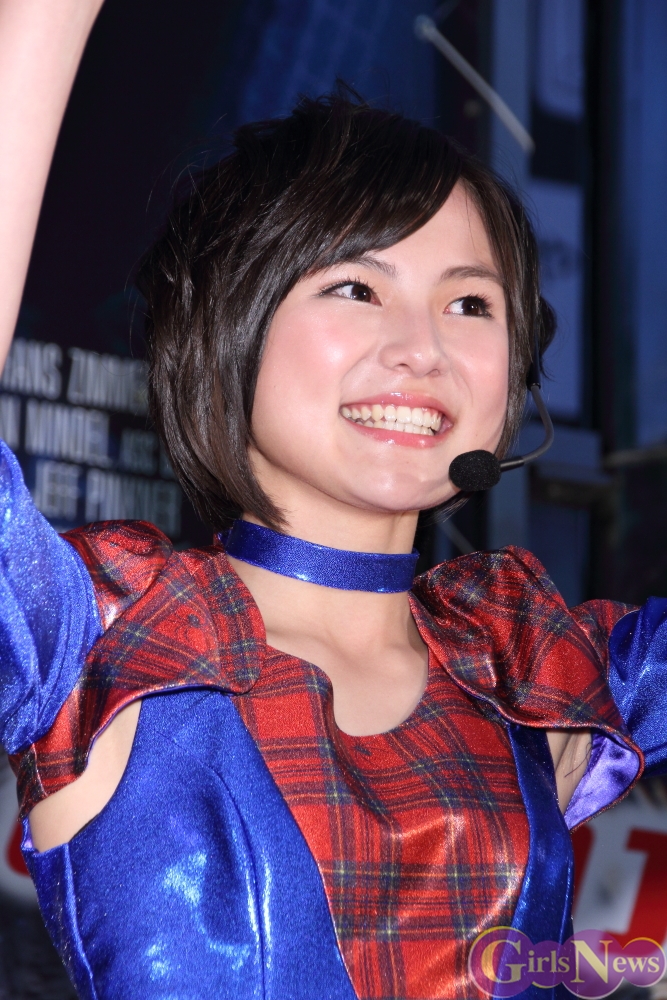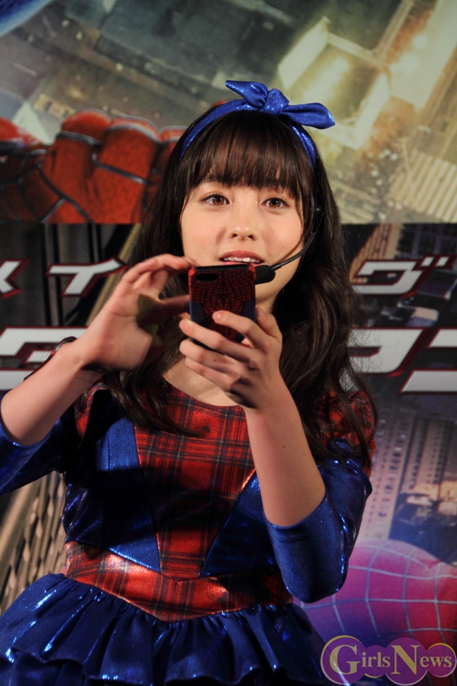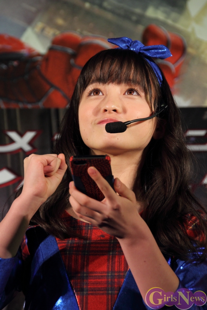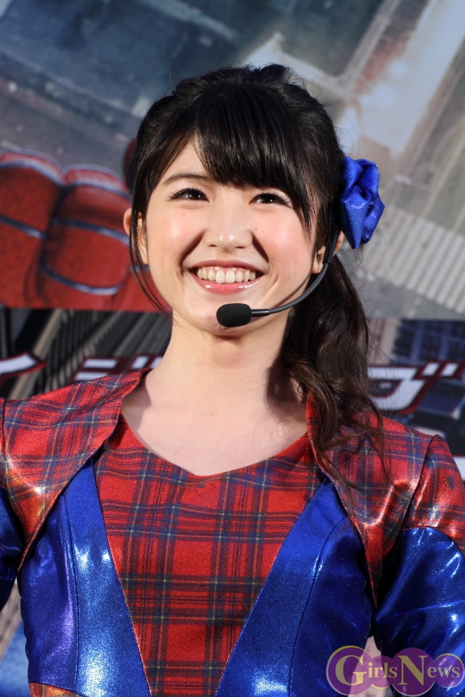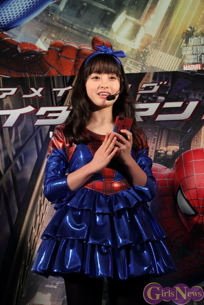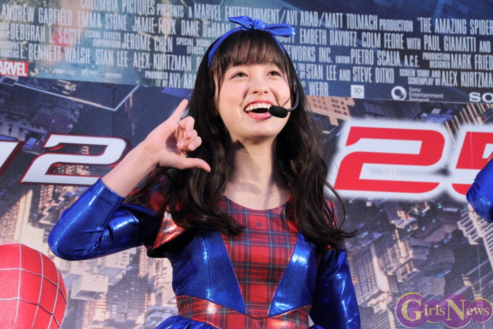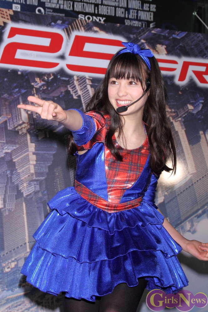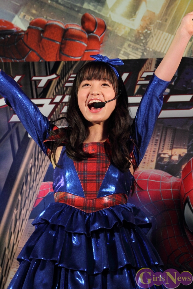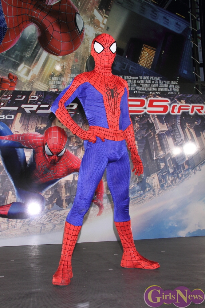 4月24日、映画『アメイジング・スパイダーマン2』の公開を記念した前夜祭イベントが新宿ステーションスクエアで行われ、ダンスボーカルアイドルユニットRev.from DVLの橋本環奈さん、秋山美穂さん、四宮なぎささんがスパイダーマンをイメージしたスパイディカラー(赤×青)のキュートなミニワンピ姿で登場した。
