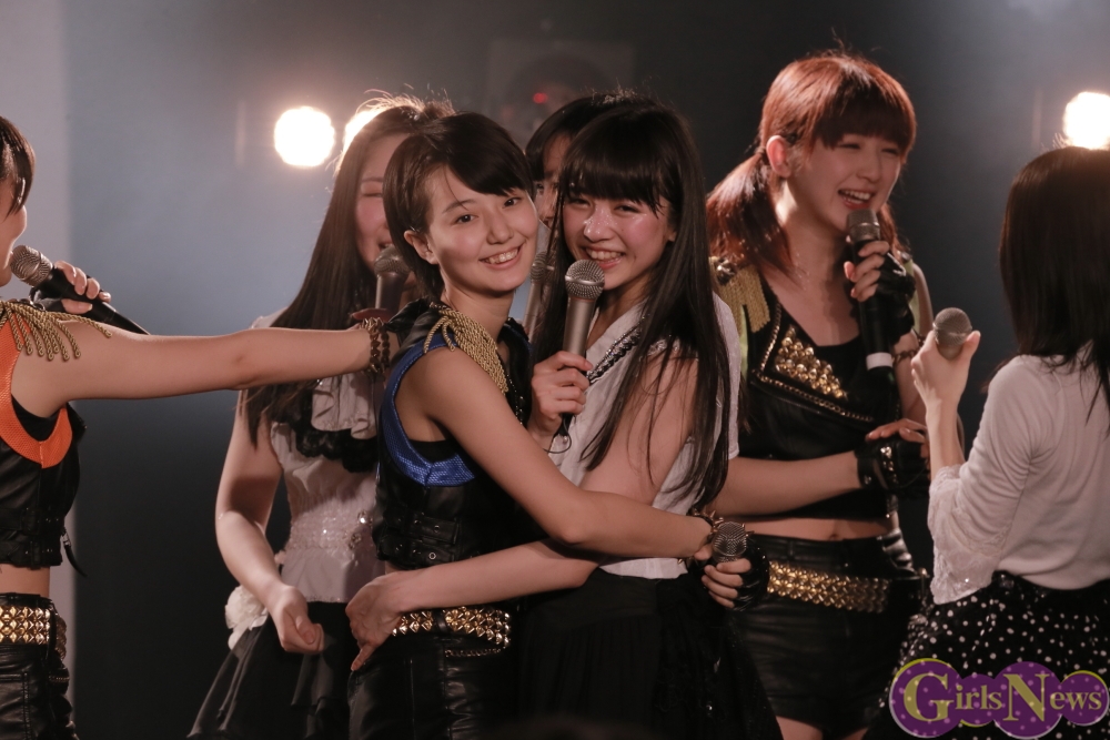 敵軍のエースを前に一歩も引かない姿勢を見せていたアップアップガールズ(仮)の新井愛瞳さんも、ラストで全員登壇したMCでは女子流の新井ひとみさんと固く手を握り、そして抱き合ってすっかり打ち解けた様子だった。