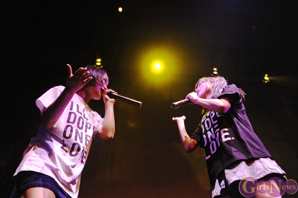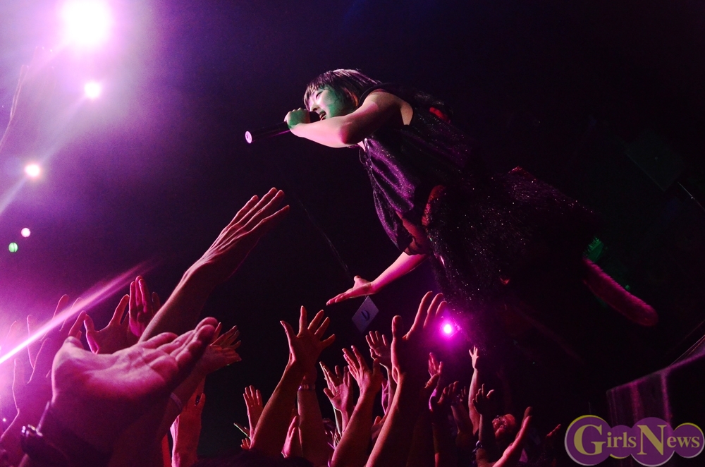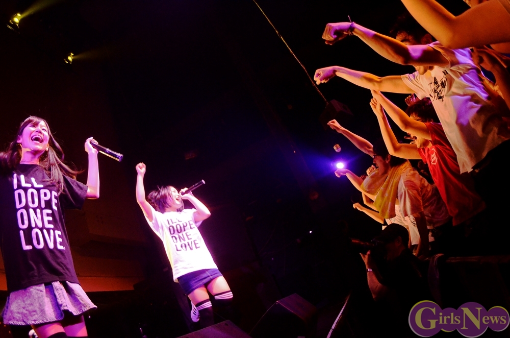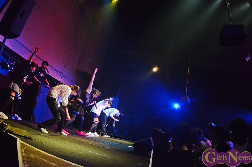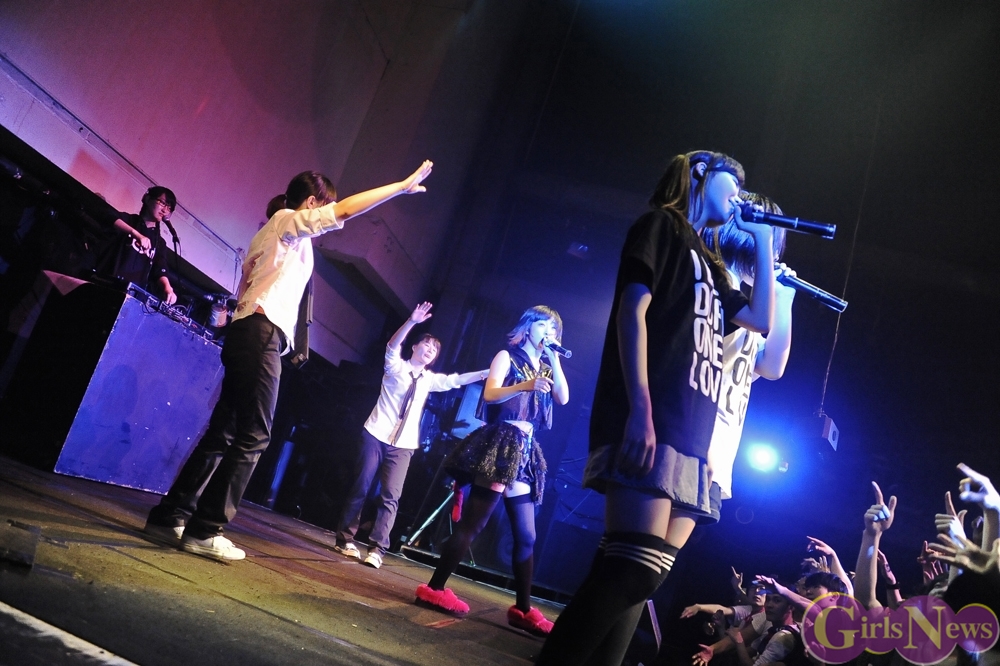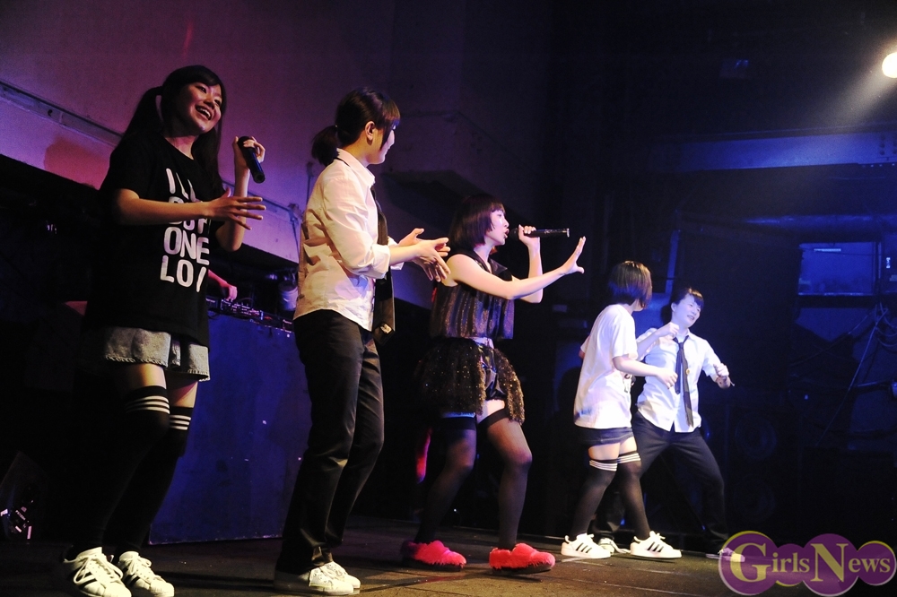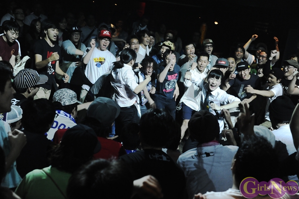 続いて登場したのはライムベリーの3人。ラップとアイドルを高いレベルでハイブリッドさせたパフォーマンスは高い人気を誇り、この春からは3人態勢で新たなスタートを切った。1曲目の「WE ARE BACK!」は、タイトル通りファンへの復活報告ソング。続けて「SUPERMCZTOKYO」「HEY!BROTHER」「世界中にアイラブユー」などライムベリー屈指の人気曲を次々と繰り出し、再始動に付きまとった雑音をパフォーマンスで一蹴した。待ちわびたファンもこの魂のセットリストに興奮を爆発させる。ライムベリーのホームともいえるライブハウスは、熱気が渦巻きジャンプで大きく揺れた。ライブ後半では、2日前に行われた復活ライブで披露された新曲「IN THE HOUSE」も披露。こちらはライムベリーとしては新しい曲調に仕上がった一曲で、ライムベリー第二章の門出にふさわしい1曲だ。そして、「まず太鼓」「MAGICPARTY」と再び超アッパーチューンを続けてライブは終了。完全復活を強く印象付ける45分間だった。