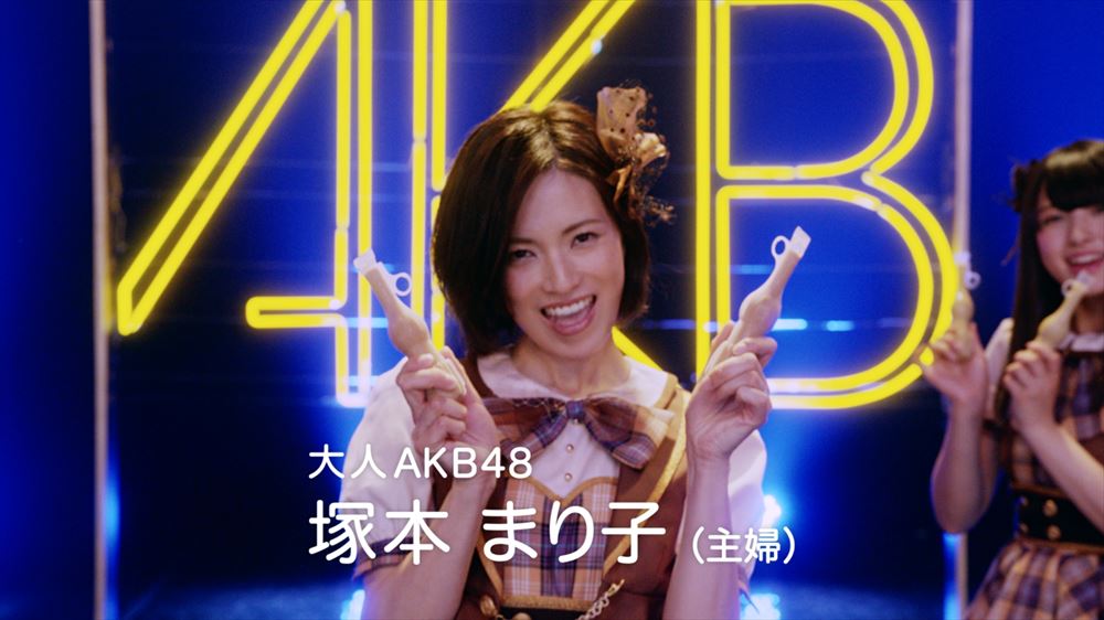 そんな塚本まり子さんが登場する「パピコ大人AKB48 登場」篇は、「パピコ」を手に、渡辺麻友さんや島崎遥香さんらAKB48メンバーと歌やダンスを披露する”アイドル”としての顔と、家事や育児など日常生活を送る”ママ”としての顔が描かれている。
