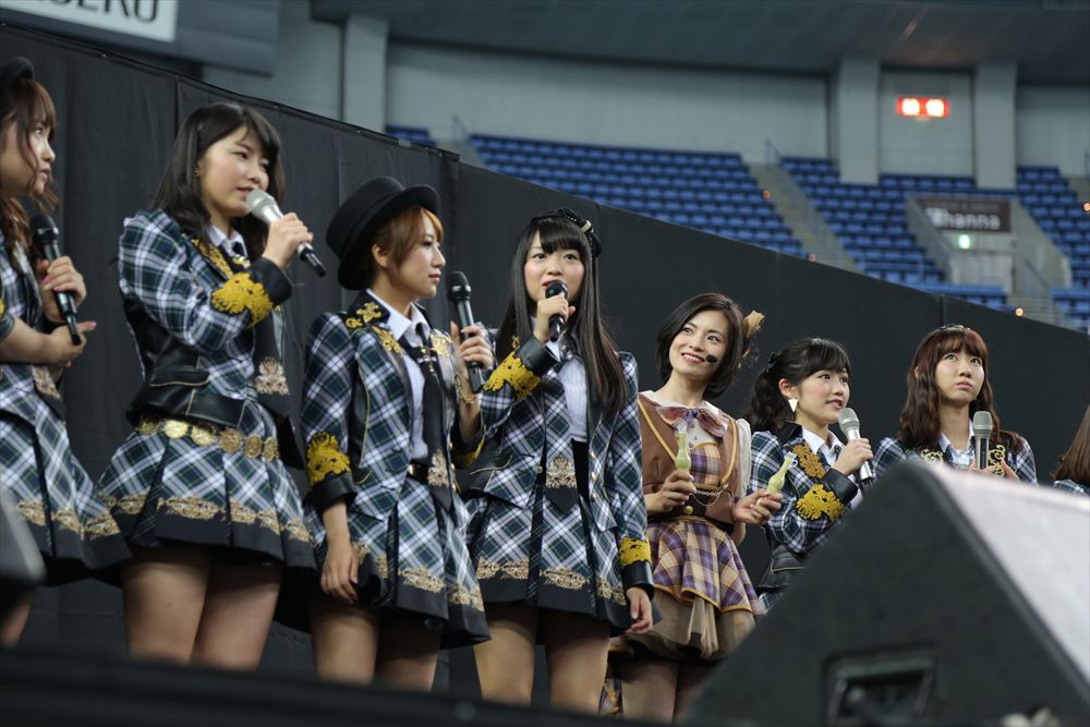 「パピコ」2014年春キャンペーンの一環として、5000通を超える応募の中から見事「大人AKB48」に決定した塚本まり子さん。今回は「パピコ」のCM衣裳でステージにサプライズで登場し、ファンからは大歓声が沸き起こった。