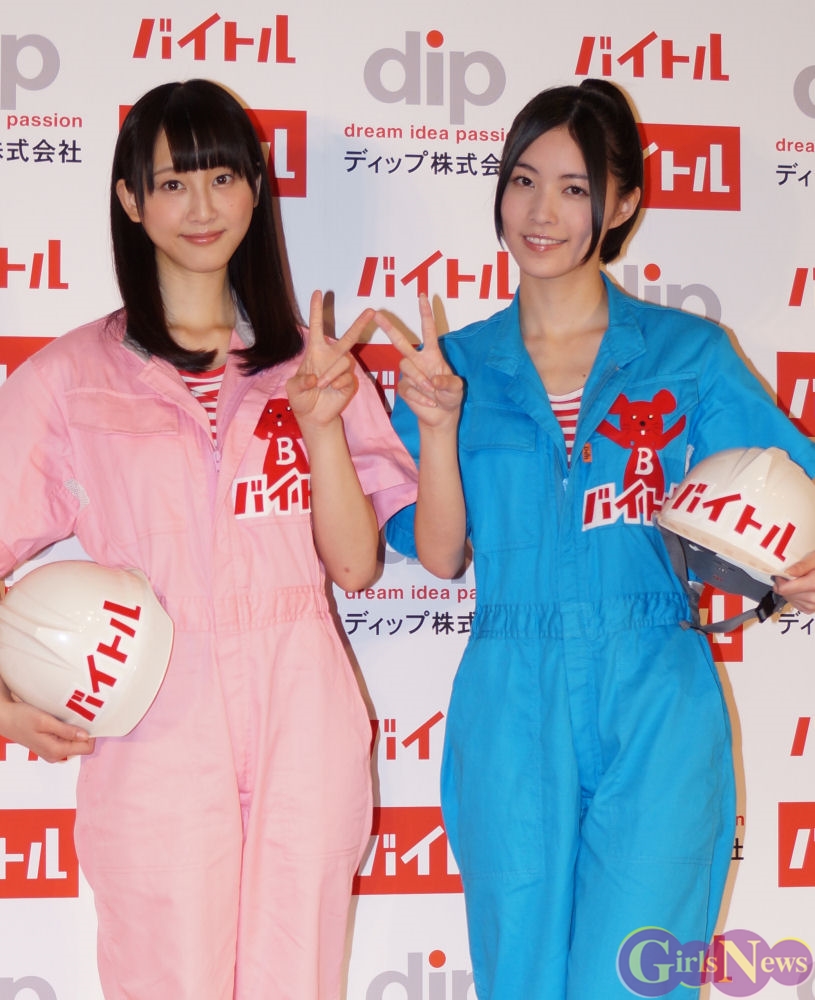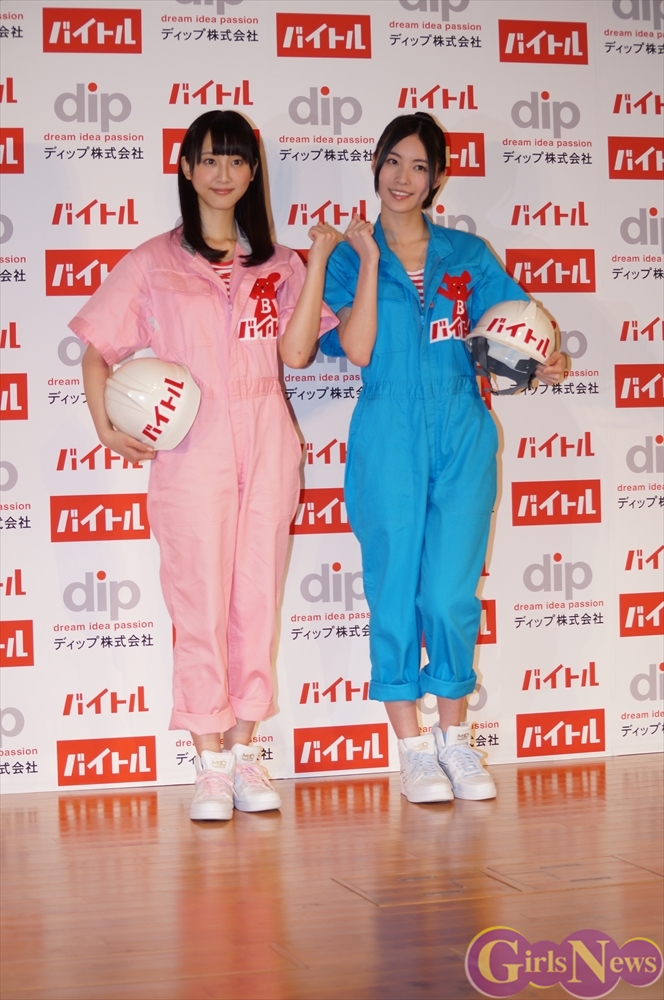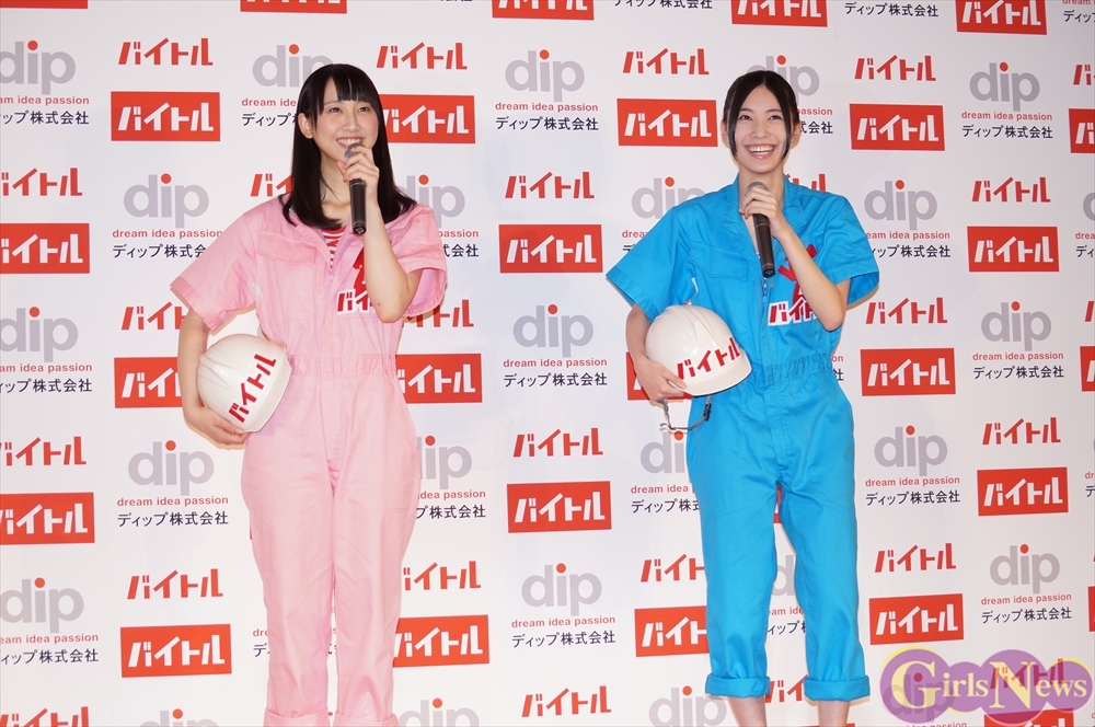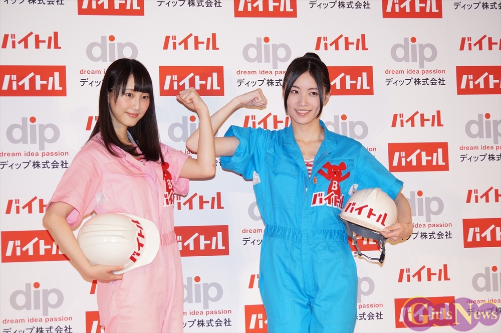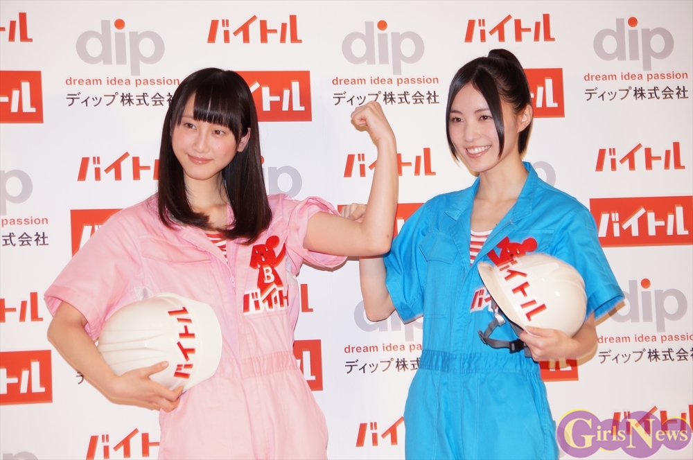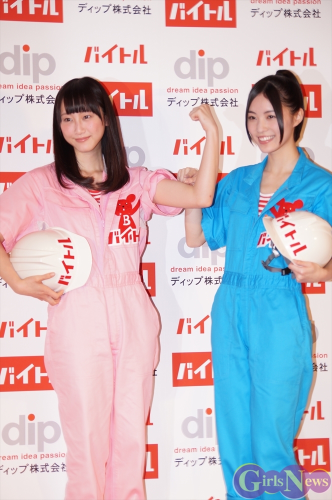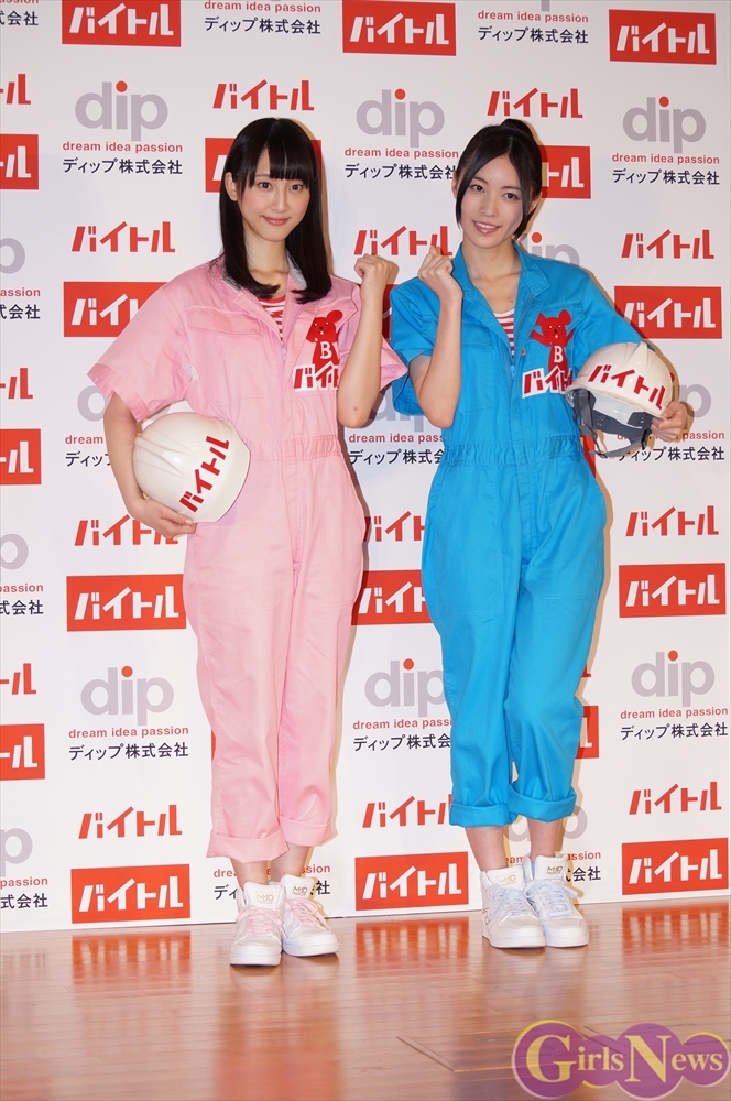 SKE48 松井玲奈&松井珠理奈が「バイトル」の新CM発表会でドボジョのつなぎ衣装を披露!