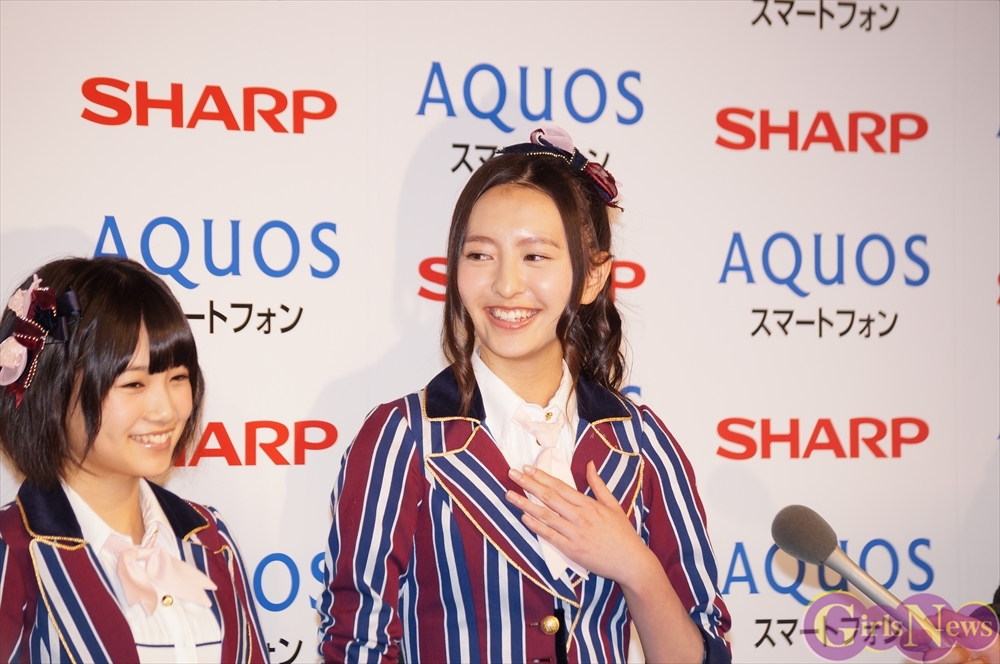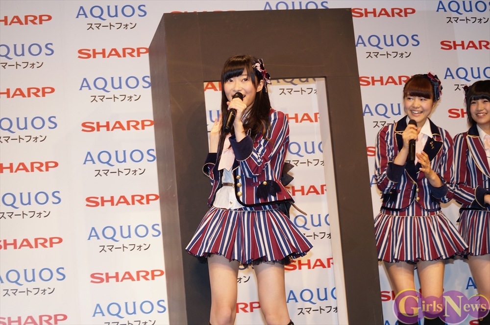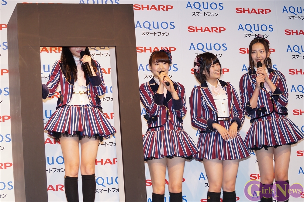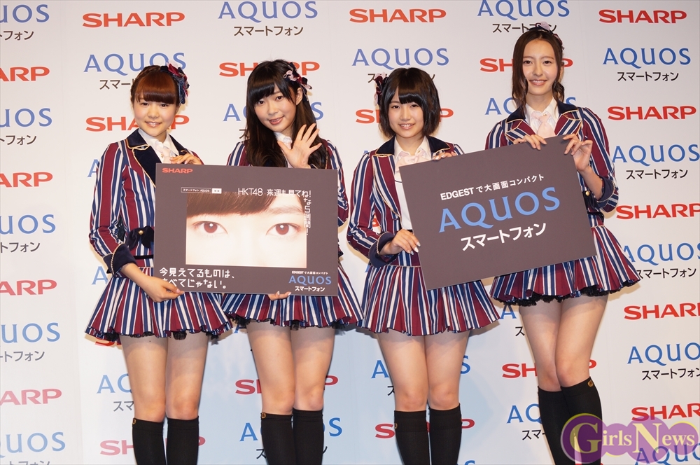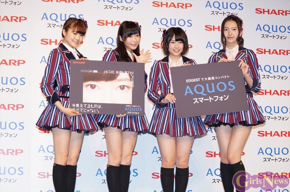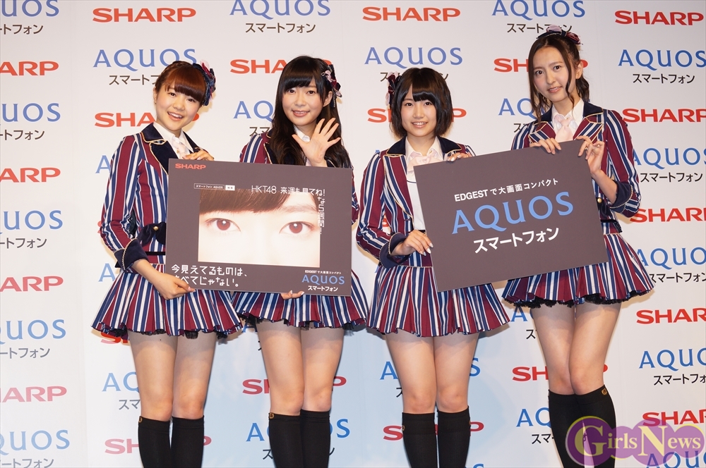 5月14日、SHARP AQUOS スマートフォン キャンペーン発表会が都内で行われ、アイドルグループ HKT48の穴井千尋・指原莉乃・朝長美桜・森保まどかの4人が登場した。