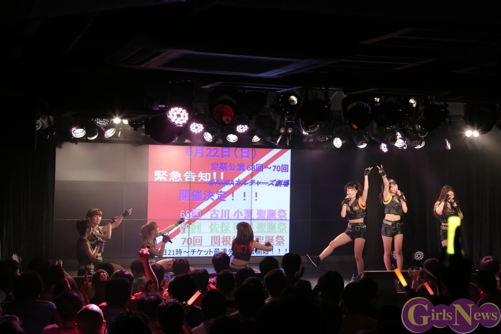 この日はサンプラザ決戦以降のスケジュールについても発表された。まずは6月22日に、同じAKIBAカルチャーズ劇場で定期公演を開催する。こちらは毎年恒例となっている6月生まれメンバーの生誕祭であり、古川小夏さん・佐保明梨さん・関根梓さんがそれぞれ1公演ずつセルフプロデュースする予定になっている。そして、7月1日には両A面シングル「全力!Pump up!!/このメロディを君と」をリリースすることも発表。さっそく披露した「このメロディを君と」は、メッセージ性が伝わる歌詞をEDMに載せた、アプガの新たな定番になりそうな一曲だ。メンバーがペアになって踊る、キュートな振り付けも見逃せない。