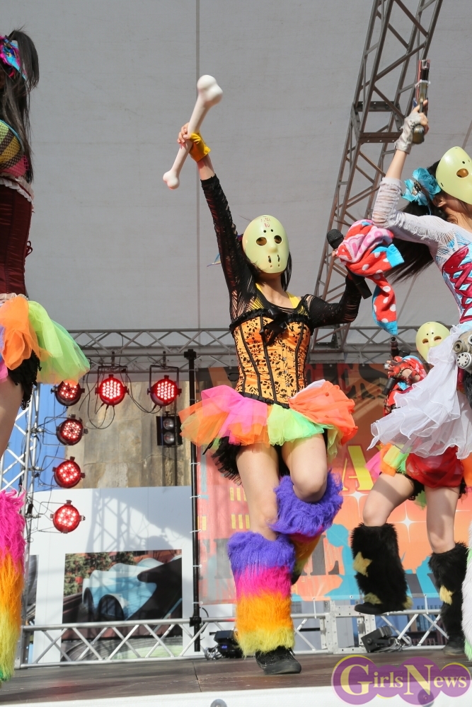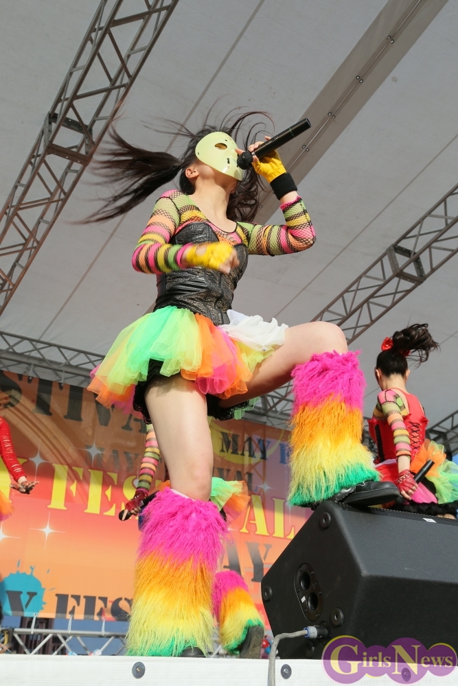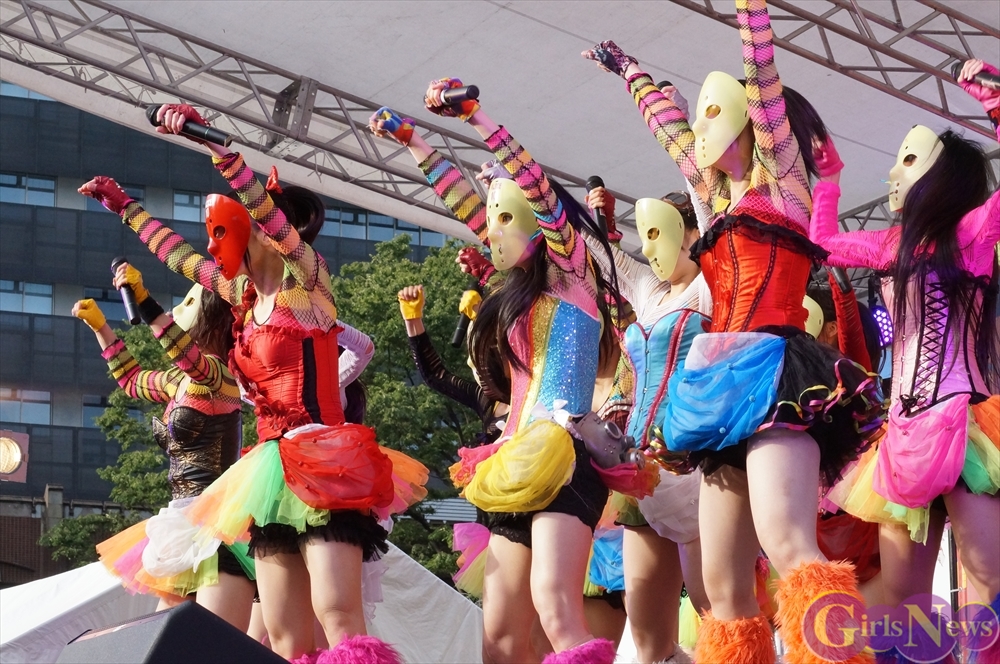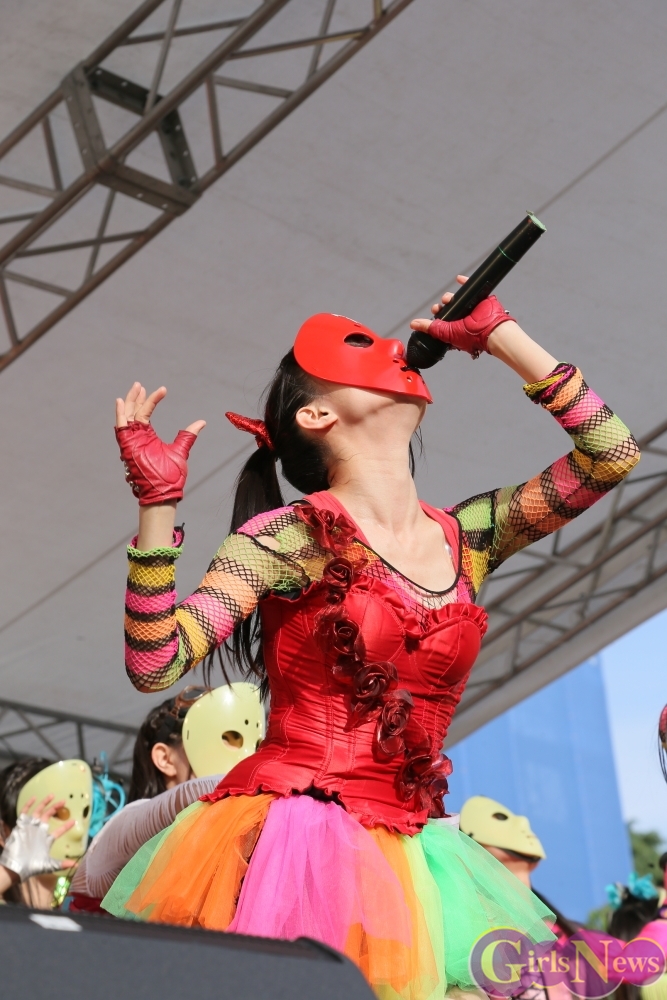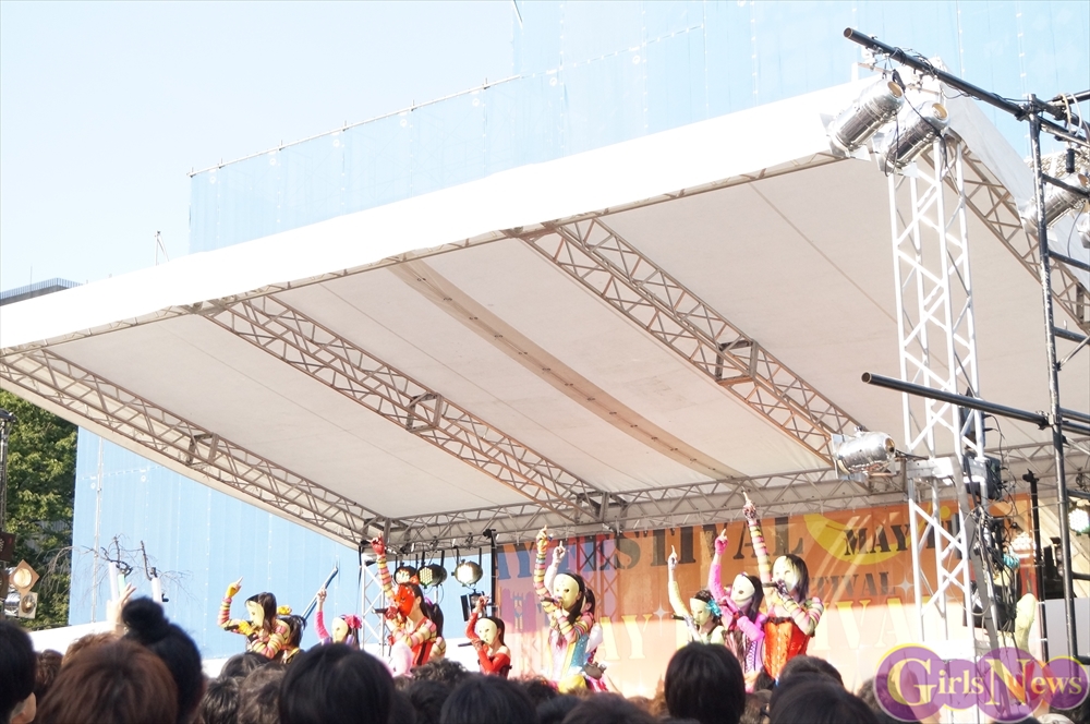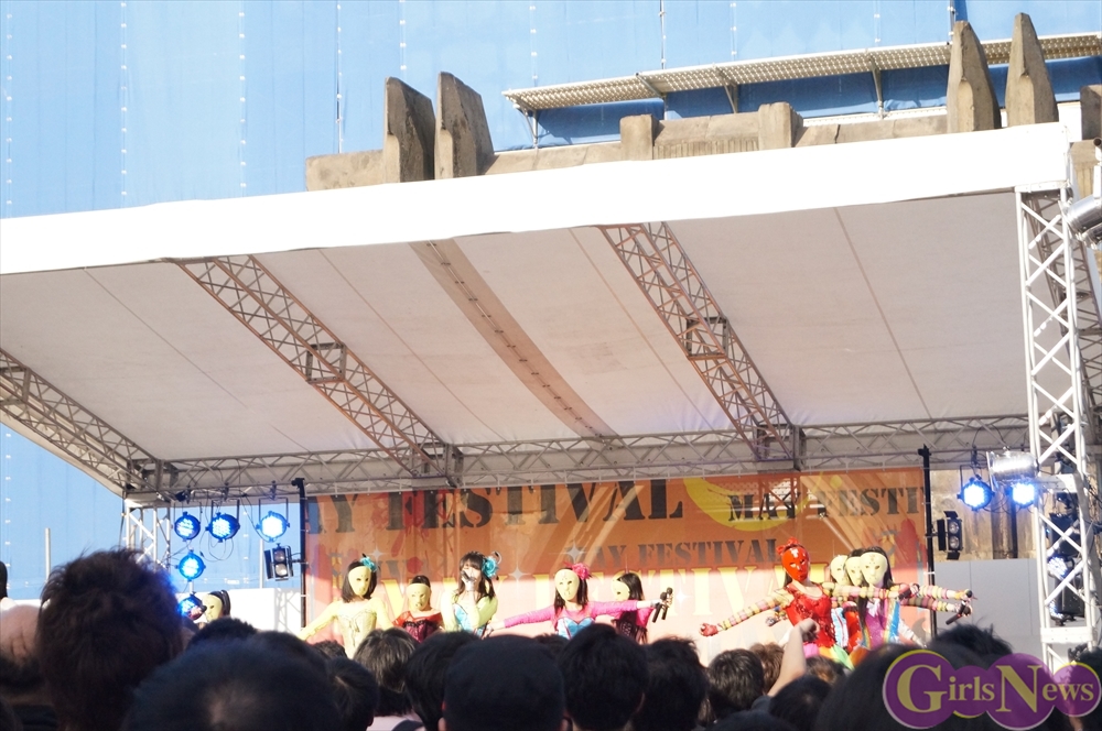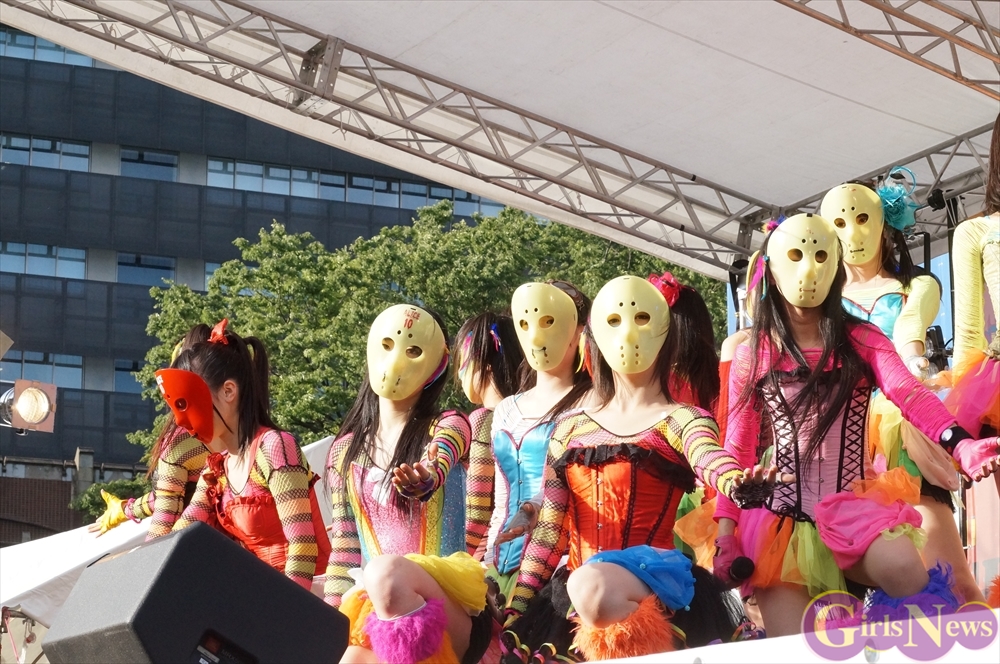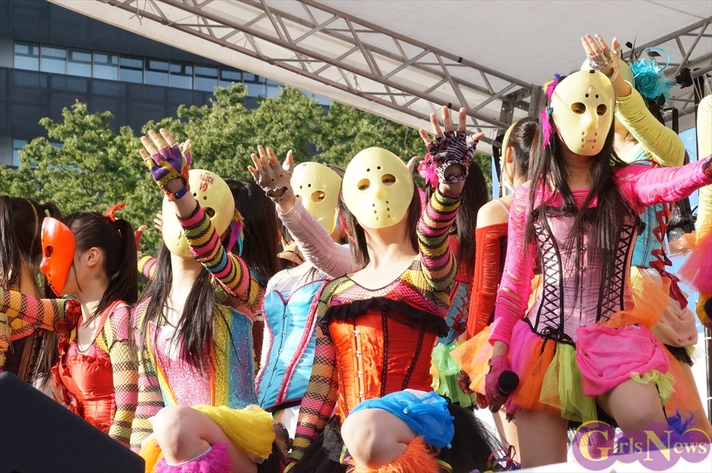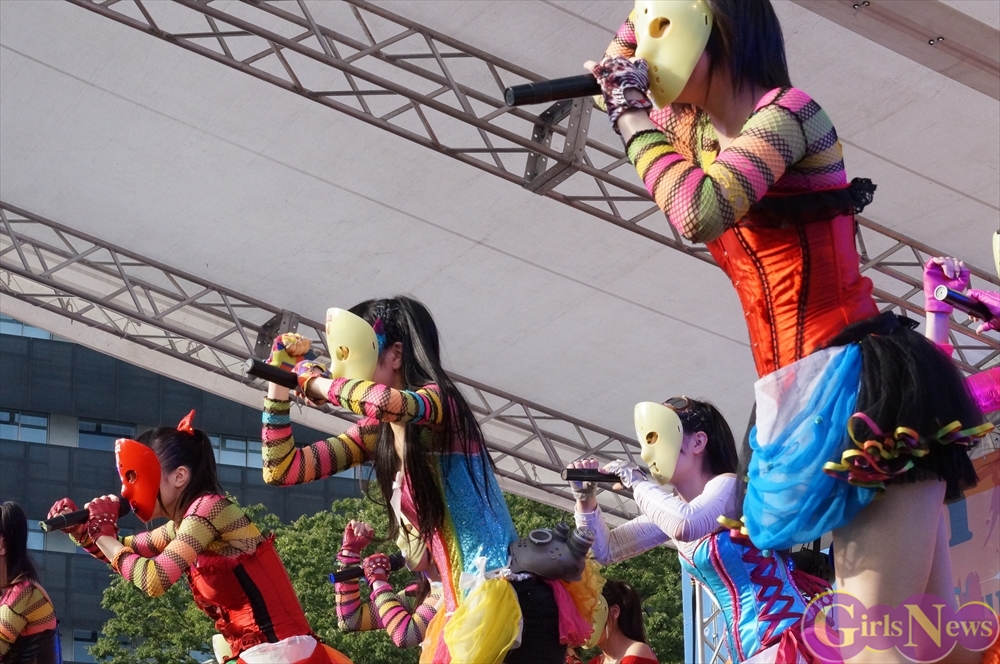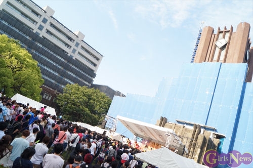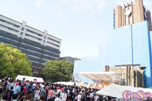 この日は青空が広がりまるで夏のような陽射しであったが、仮面女子が出演した17時前後は穏やかな日光が降り注ぎ、会場全体にそよ風が吹き込む心地よい天候。この日の舞台である本郷キャンパスは、毎年恒例の学園祭「五月祭」が開催され、露店が多数出店されお祭りムード一色。そして、安田講堂前ステージには、今年も仮面女子のファンや東大生が多数集結していた。