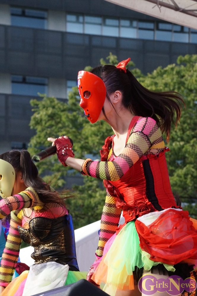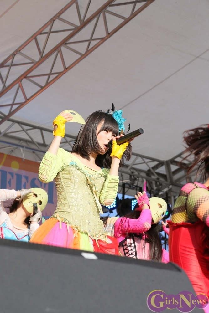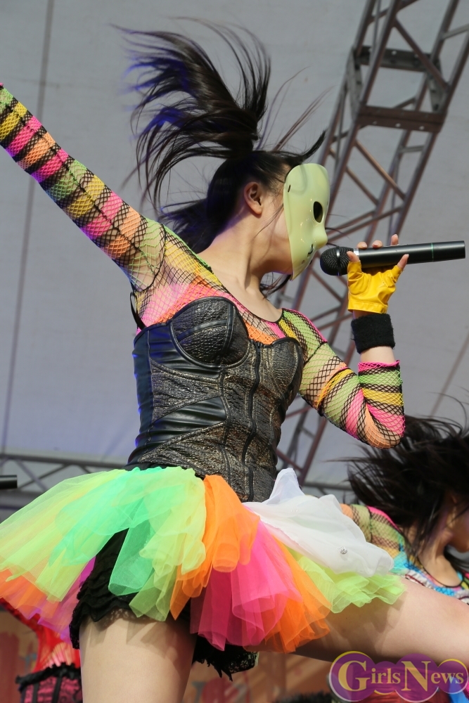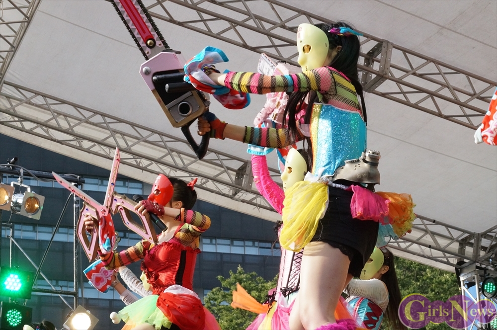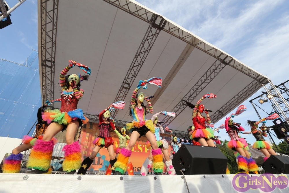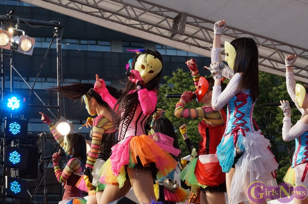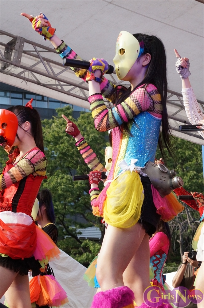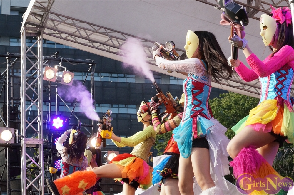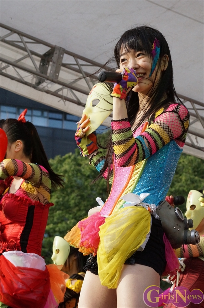 この日は青空が広がりまるで夏のような陽射しであったが、仮面女子が出演した17時前後は穏やかな日光が降り注ぎ、会場全体にそよ風が吹き込む心地よい天候。この日の舞台である本郷キャンパスは、毎年恒例の学園祭「五月祭」が開催され、露店が多数出店されお祭りムード一色。そして、安田講堂前ステージには、今年も仮面女子のファンや東大生が多数集結していた。