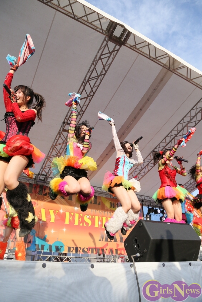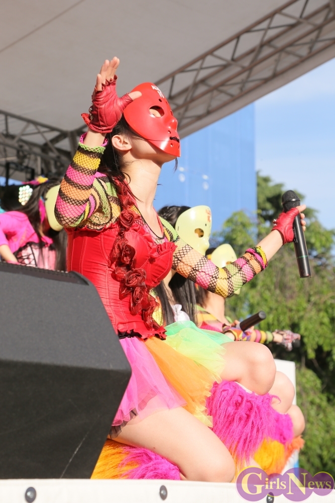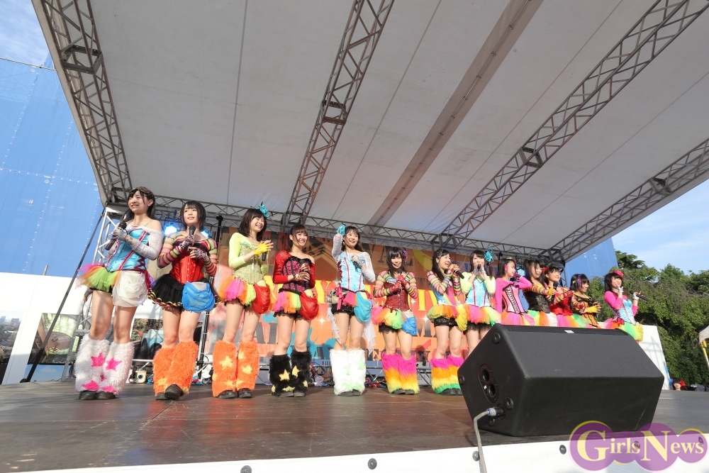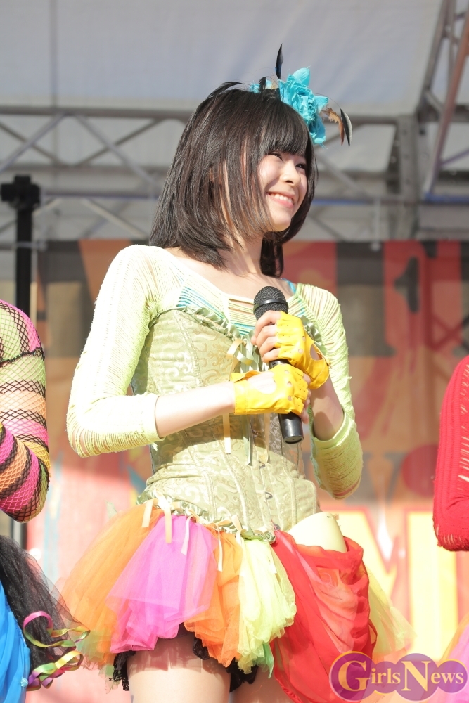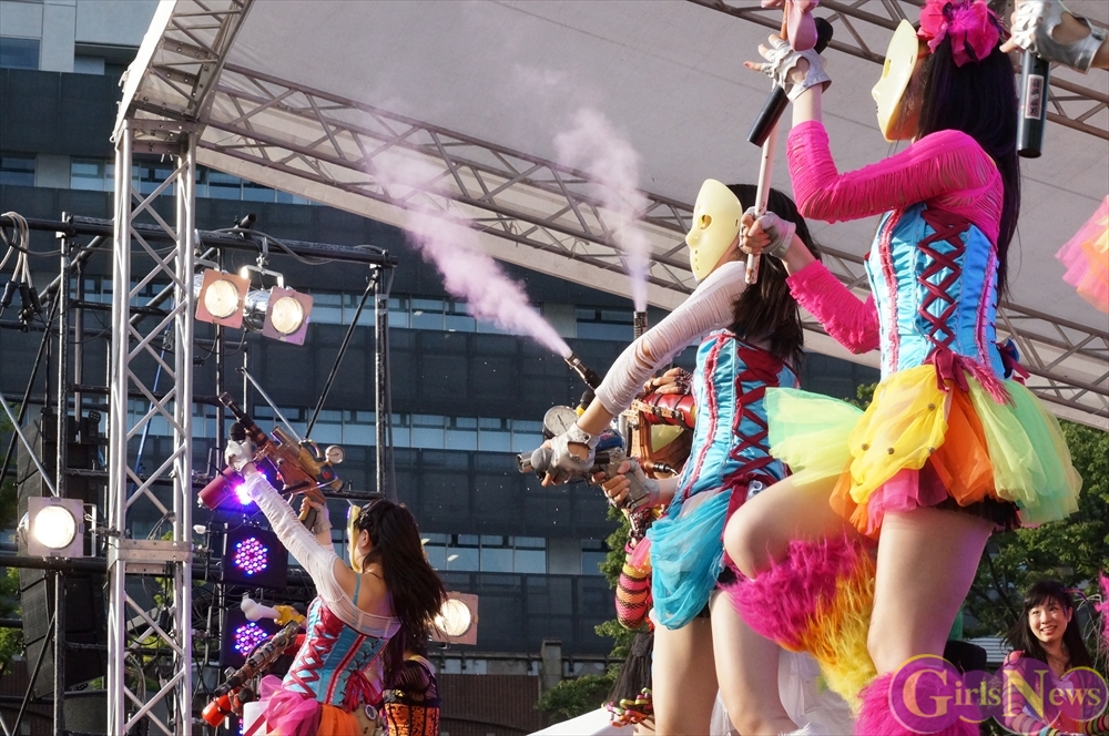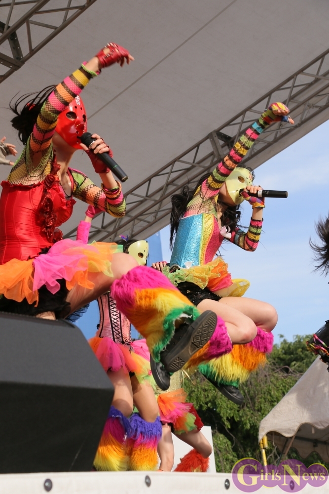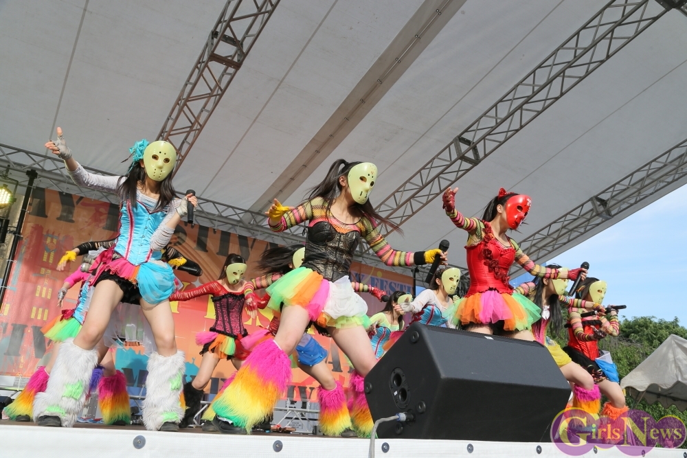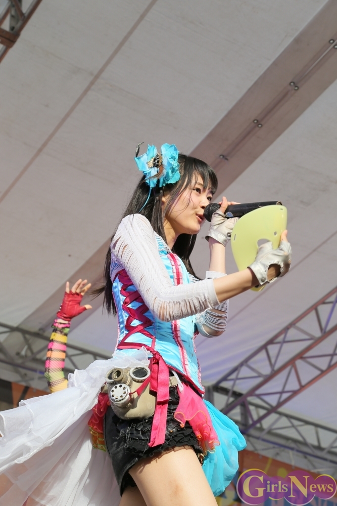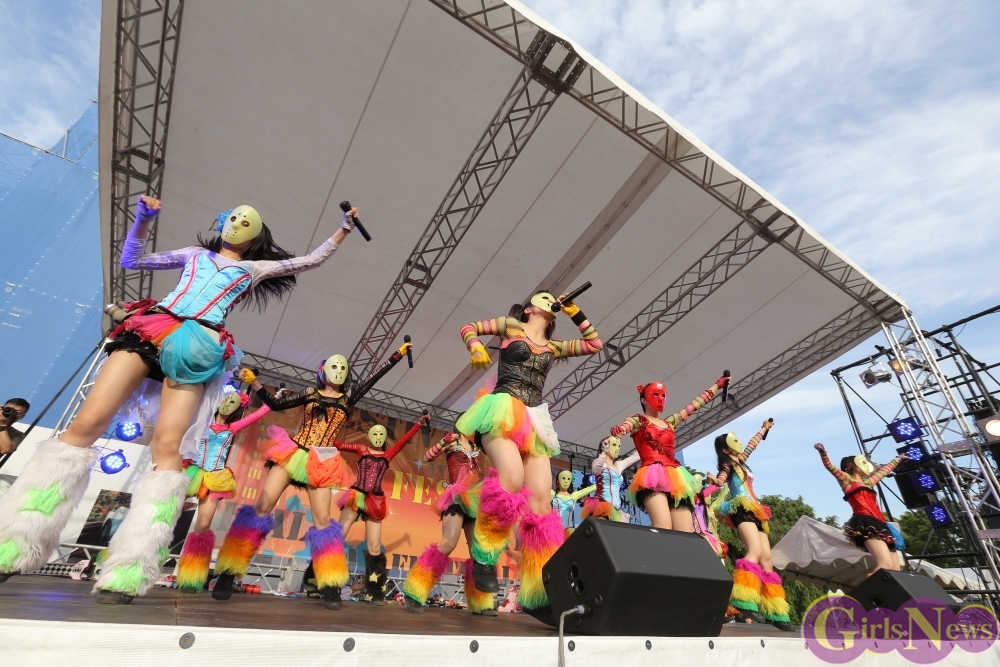 この日は青空が広がりまるで夏のような陽射しであったが、仮面女子が出演した17時前後は穏やかな日光が降り注ぎ、会場全体にそよ風が吹き込む心地よい天候。この日の舞台である本郷キャンパスは、毎年恒例の学園祭「五月祭」が開催され、露店が多数出店されお祭りムード一色。そして、安田講堂前ステージには、今年も仮面女子のファンや東大生が多数集結していた。