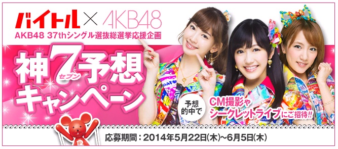 AKB48グループがCMに出演中のバイトルが、「AKB48 37thシングル選抜総選挙」応援企画として『神7(セブン)予想キャンペーン』を行うことが発表された。