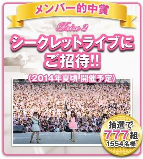 2014年5月20日(火)から投票開始し、6月7日(土)に結果発表となる「AKB48 37thシングル選抜総選挙 夢の現在地~ライバルはどこだ?~」。上位7位(神7)を完全的中させた方の中から抽選で7名様がAKB48のCM撮影現場に、また7名のメンバーを的中させた方の中から抽選で777組1,554名様がシークレットライブに招待される。応募期間は5月22日(木)10時~6月5日(木)10時まで。