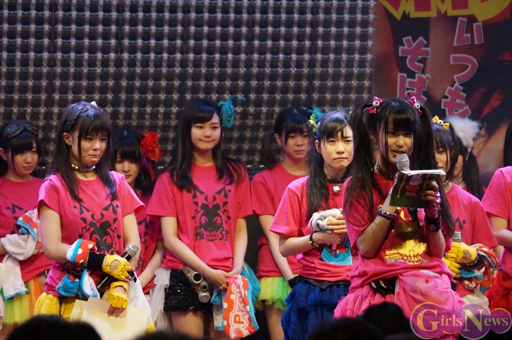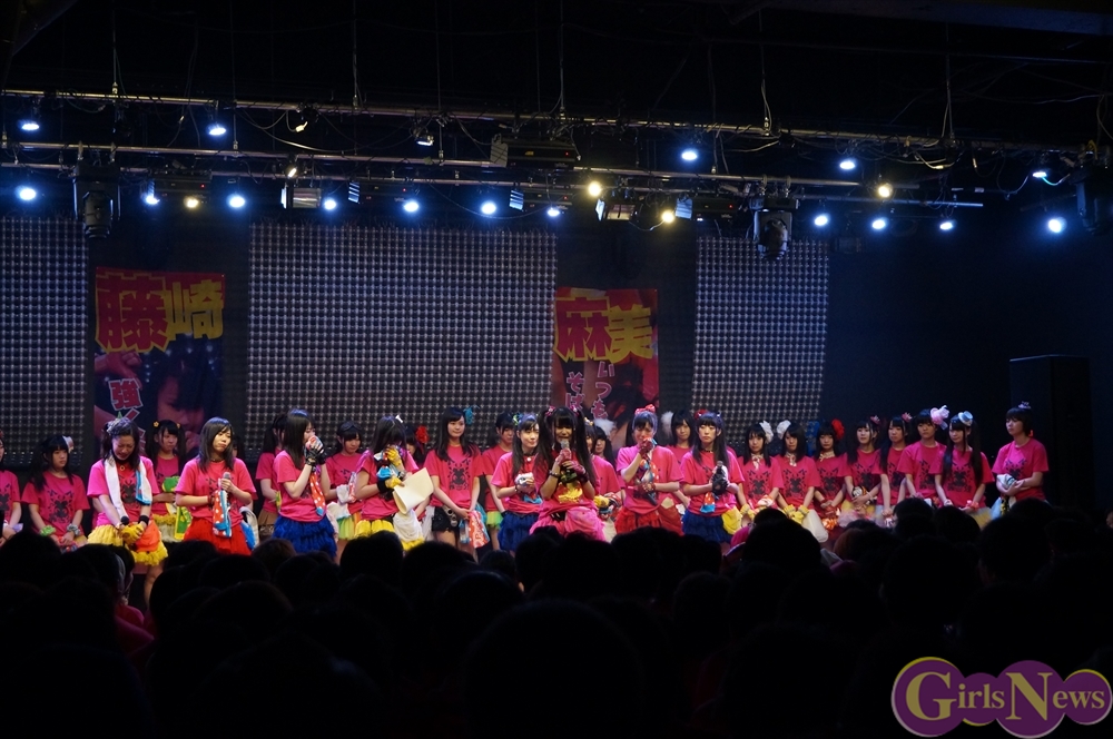 その後の卒業セレモニーでは、藤崎麻美さんの卒業を記念して「贈る言葉」をメンバーとファンが熱唱。すると、藤崎麻美さんのファンの方々が用意したクロミちゃんのケーキが登場!まずはケーキを囲んで記念撮影。その後はもちろんケーキの試食。自身が希望したというチョコレートケーキに藤崎麻美さんは「おいしい!」と満足そうな表情。直後に、森カノンさんが「一人じゃ食べられないから、あさんたん食べさせて!」と欲しがる。欲しがりな森カノンさんには藤崎麻美さんが絶対にひと口では食べきれない量のケーキをすくって「あ~ん♪」と食べさせてあげる。さすがに入りきらず、口の周りをケーキで汚しながらも嬉しそうな森カノンさんだった。さらに、ファンからは恒例となっているヲタ図鑑や藤崎麻美さんの写真が詰まった写真集のプレゼント!また、メンバーからはジェイソンマスクに寄せ書きをしてプレゼント。その他にも、大量の花束やメッセージカードのプレゼントがあり、もちろん藤崎麻美さんの卒業記念Tシャツのプレゼントもあった。卒業Tシャツはメンバー全員分用意されているが、他のメンバーの卒業Tシャツの文字が黒色であるのに対し、藤崎麻美さんの卒業Tシャツだけは特別仕様のゴールド!これには藤崎麻美さんも嬉しそうな様子だった。
